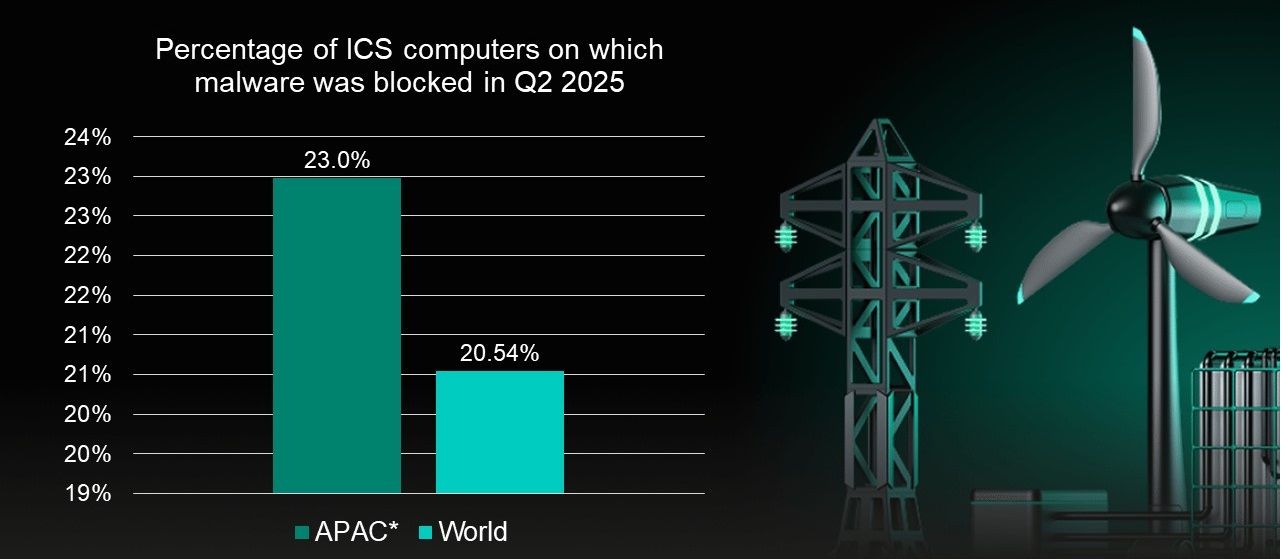 เมื่อพิจารณาจากสัดส่วนโดยรวมของคอมพิวเตอร์ ICS ที่ถูกบล็อกวัตถุอันตราย ในไตรมาสที่ 2 ปี 2025 พบว่าเอเชียแปซิฟิกมีสัดส่วนที่ 23% ซึ่งสูงกว่าค่าเฉลี่ยทั่วโลกที่มี 20.54% อยู่เกือบ 3%