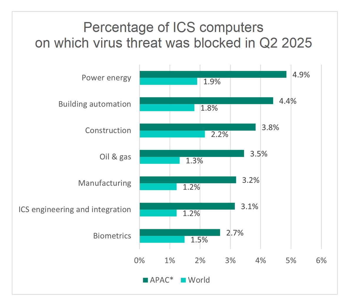 อุตสาหกรรมในภูมิภาคเอเชียแปซิฟิกที่ได้รับผลกระทบจากภัยคุกคามจากไวรัสมากที่สุดในไตรมาสที่ 2 ปี 2025 ได้แก่ พลังงานไฟฟ้า ระบบอัตโนมัติในอาคาร น้ำมันและก๊าซ การผลิต และวิศวกรรมและบูรณาการระบบ ICS