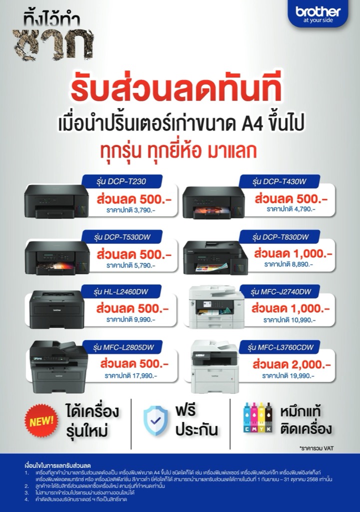บราเดอร์ ประเทศไทย ตอกย้ำวิสัยทัศน์ด้านความยั่งยืน เปิดตัวแคมเปญเทรดอินครั้งยิ่งใหญ่ในชื่อ “ทิ้งไว้ทำซาก” เชิญชวนผู้บริโภคและภาคธุรกิจนำเครื่องพิมพ์เก่าขนาด A4 ทุกรุ่น ทุกยี่ห้อ ไม่ว่าจะอยู่ในสภาพใดก็ตาม มาแลกรับส่วนลดทันทีสูงสุด 2,000 บาท เพื่อซื้อเครื่องพิมพ์บราเดอร์เครื่องใหม่ในรุ่นที่ร่วมรายการ โดยแคมเปญจะจัดขึ้นเป็นระยะเวลา 2 เดือน ตั้งแต่ วันที่ 1 กันยายน – 31 ตุลาคม 2568 โดยตั้งเป้าหมายผู้เข้าร่วมกว่า 3,000 ราย เพื่อจัดการปัญหาขยะอิเล็กทรอนิกส์ (E-Waste) อย่างจริงจัง พร้อมกระตุ้นตลาดด้วยการมอบนวัตกรรมและความคุ้มค่าให้แก่ผู้บริโภค
