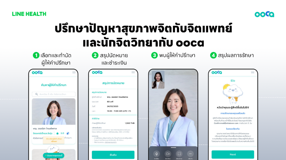 • ooca บริการด้านสุขภาพจิตที่ให้พบจิตแพทย์หรือนักจิตวิทยาผ่านวิดีโอคอล เลือกผู้ให้คำปรึกษาและเวลานัดหมายได้เอง เหมาะสำหรับผู้ที่ต้องการพูดคุยหรือหาทางออกในช่วงเวลาที่เครียด