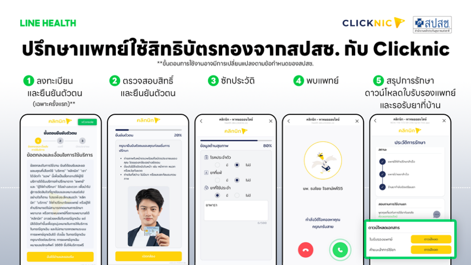 • Clicknic บริการปรึกษาแพทย์ออนไลน์สำหรับผู้ที่ใช้สิทธิบัตรทอง 42 กลุ่มอาการทั่วไป สามารถยืนยันตัวตนผ่าน e-KYC ตรวจสอบสิทธิ์ และพบแพทย์ออนไลน์โดยไม่เสียค่าใช้จ่าย