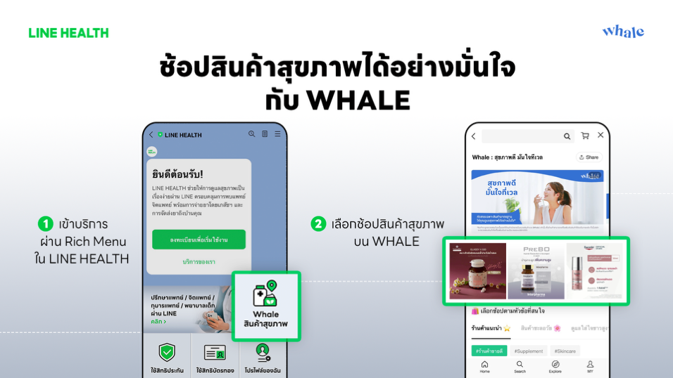 นอกจากนี้ ยังสามารถเลือกซื้อสินค้าคุณภาพในกลุ่มวิตามินและอาหารเสริม รวมถึงผลิตภัณฑ์เสริมและบำรุงความงามได้อย่างมั่นใจ จากการคัดสรรค์ภายใต้มาตรฐานของ LINE ได้ที่ WHALE ได้อีกด้วย