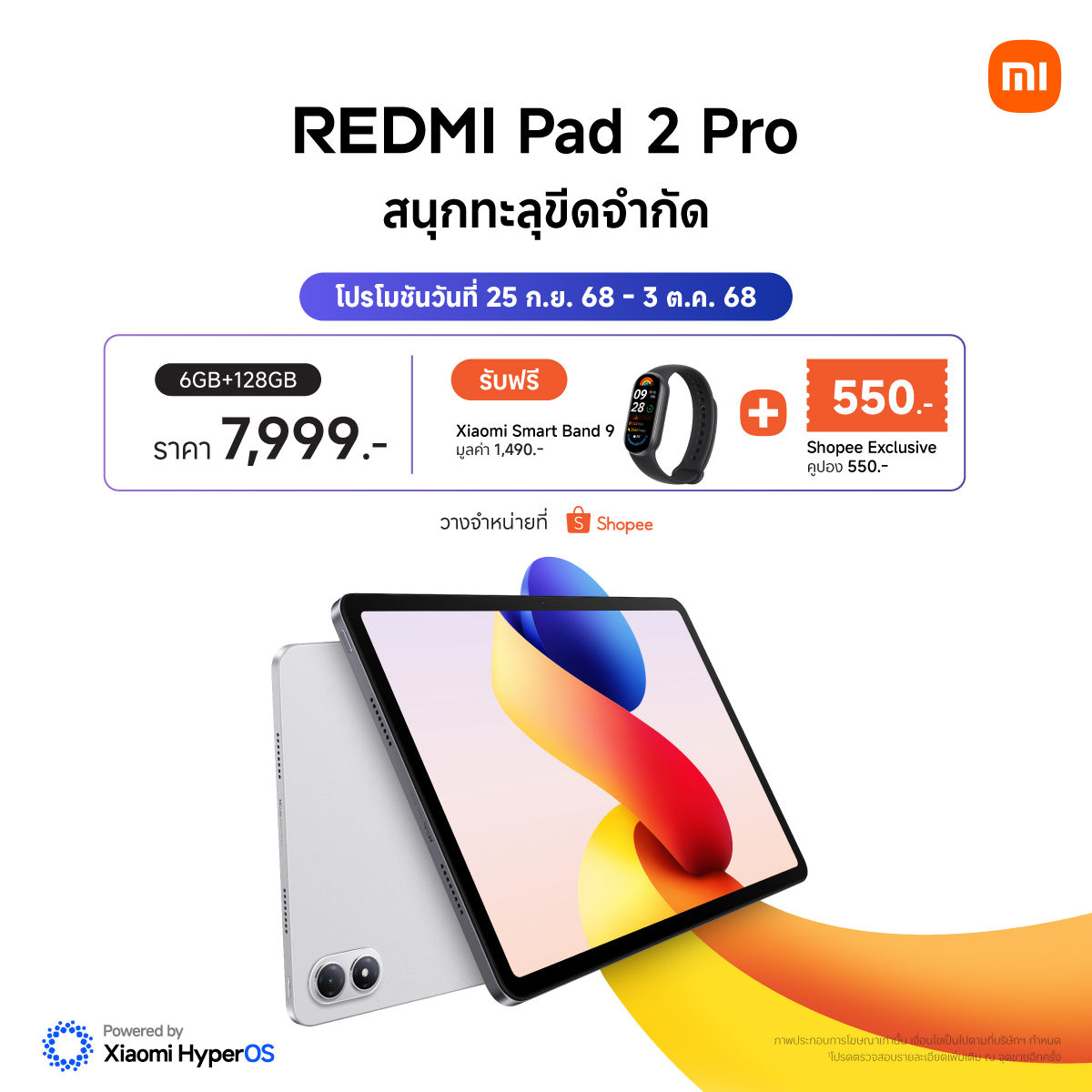 REDMI Pad 2 Pro มีให้เลือก 2 สี ได้แก่ Graphite Gray และ Lavender Purple พร้อมวางจำหน่ายในประเทศไทยแล้ววันนี้ ในรุ่นความจุ 6GB + 128GB ในราคา 7,999 บาท พิเศษ! เฉพาะลูกค้าที่ซื้อ REDMI Pad 2 Pro รุ่นความจุ 6GB + 128GB ในระหว่างวันที่ 25 กันยายน 2568 – 3 ตุลาคม 2568 ผ่านช่องทางการจัดจำหน่ายออนไลน์ Shopee รับฟรี Xiaomi Smart Band 9 มูลค่า 1,490 บาทและ Shopee Exclusive คูปองมูลค่า 550 บาท หรือเมื่อซื้อผ่านช่องทางการจัดจำหน่ายออนไลน์ mi.com, Lazada และ TikTok shop รับฟรี Redmi Smart Pen มูลค่า 1,999 บาท15