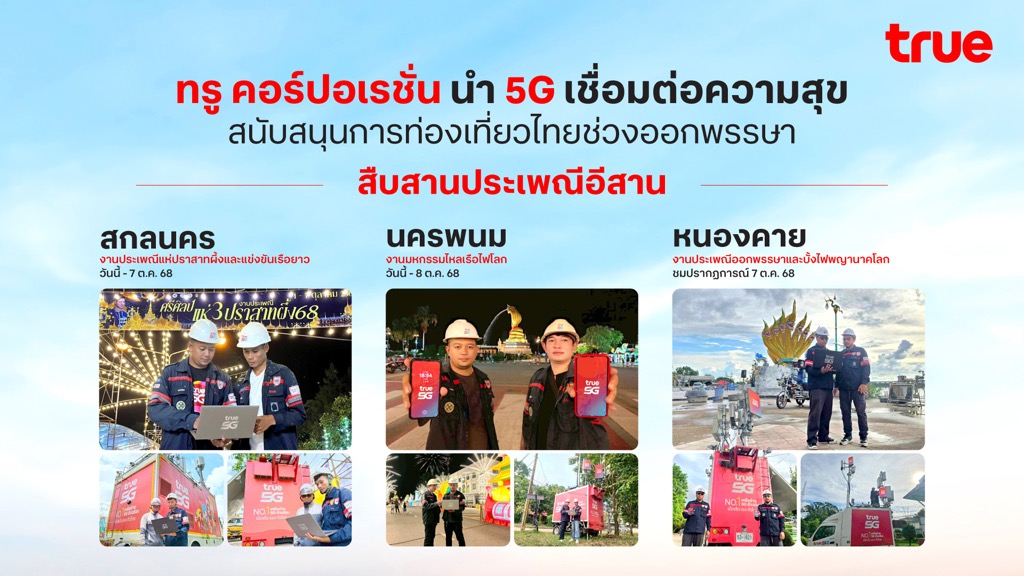 ทรู คอร์ปอเรชั่นเตรียมความพร้อมด้านเครือข่าย 5G และ 4G รองรับนักท่องเที่ยวทั้งไทยและต่างชาติที่เดินทางเข้าสู่ภาคอีสานในช่วงเทศกาลประเพณีสำคัญ 3 งานใหญ่ ได้แก่ งานประเพณีแห่ปราสาทผึ้งและแข่งขันเรือยาว จังหวัดสกลนคร, งานมหกรรมไหลเรือไฟโลก จังหวัดนครพนม และงานประเพณีออกพรรษาและบั้งไฟพญานาคโลก จังหวัดหนองคาย โดยจัดเต็มโซลูชันทั้งเพิ่มรถโมบายล์สถานีฐานเคลื่อนที่เร็ว หรือ COW, เสาสัญญาณชั่วคราว, การปรับแต่งสัญญาณตามพฤติกรรมการใช้งาน, จัดทีมวิศวกรประจำพื้นที่งาน, เสริมสัญญาณบนเส้นทางคมนาคมและแหล่งท่องเที่ยว พร้อมศูนย์ปฏิบัติการเครือข่ายอัจฉริยะ (BNIC) ที่นำ AI ดูแลตลอด 24 ชั่วโมง เพื่อให้นักท่องเที่ยวได้สัมผัสประสบการณ์การเชื่อมต่อดิจิทัลต่อเนื่องและมีประสิทธิภาพตลอดการเข้าร่วมงานประเพณีอันทรงคุณค่าของชาวอีสาน พร้อมบูธกิจกรรมพิเศษภายในงานที่จังหวัดนครพนมและหนองคายเพื่อรองรับนักท่องเที่ยว รวมทั้งลูกค้าทรูและดีแทค ด้วยความสนุกและข้อเสนอพิเศษอีกด้วย