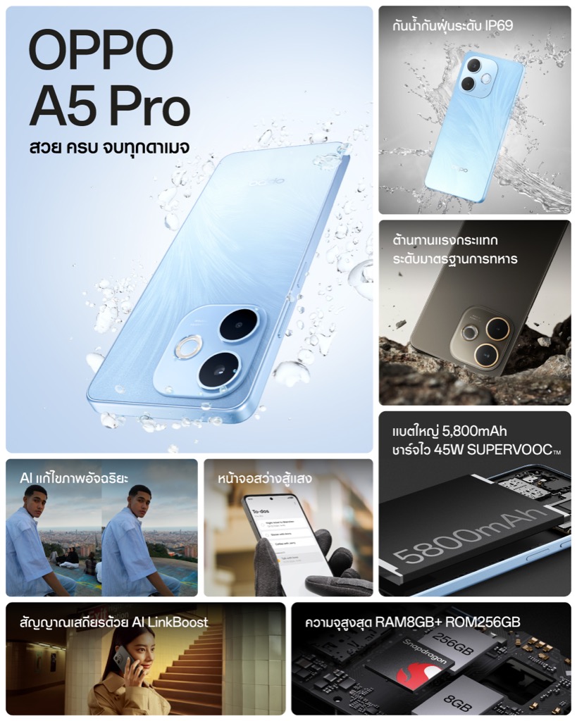 OPPO A5 Pro สวย ครบ จบทุกดาเมจ พร้อมเป็นสมาร์ตโฟนที่สุดของความทนทาน ครบ จบทุกเรื่องในเครื่องเดียว ไร้กังวลด้วยมาตรฐานกันน้ำ กันฝุ่น IP69 เป็นสมาร์ตโฟนกันน้ำที่ดีที่สุดในระดับเดียวกัน ทนทานมาตรฐานระดับทหาร ยกระดับความทนทานเหนือใคร และมาพร้อมโหมดกลางแจ้ง อย่าง Splash Touch ใช้งานไม่สะดุดแม้หน้าจอเปียก และ Glove Touch สัมผัสง่ายแม้ใส่ถุงมือ มอบประสบการณ์ความบันเทิง เล่นเกมมันส์ทุกแมตช์ได้อย่างยาวนานด้วย AI GameBoost สัญญาณเสถียร เชื่อมต่อไวด้วย AI LinkBoost มากับชาร์จไว 45W SUPERVOOC และแบตเตอรี่ขนาดใหญ่ 5,800mAh มาพร้อมดีไซน์ OPPO Glow มอบผิวสัมผัสราวกับขนนก ชวนฝัน สวยสง่าในสีฟ้า Feather Blue อีกทั้งมาพร้อมรูปลักษณ์เรียบหรูในสีน้ำตาล Mocha Brown เพิ่มระบบความปลอดภัย ป้องกันการโกงตอนจ่ายเงินด้วย Payment Protection