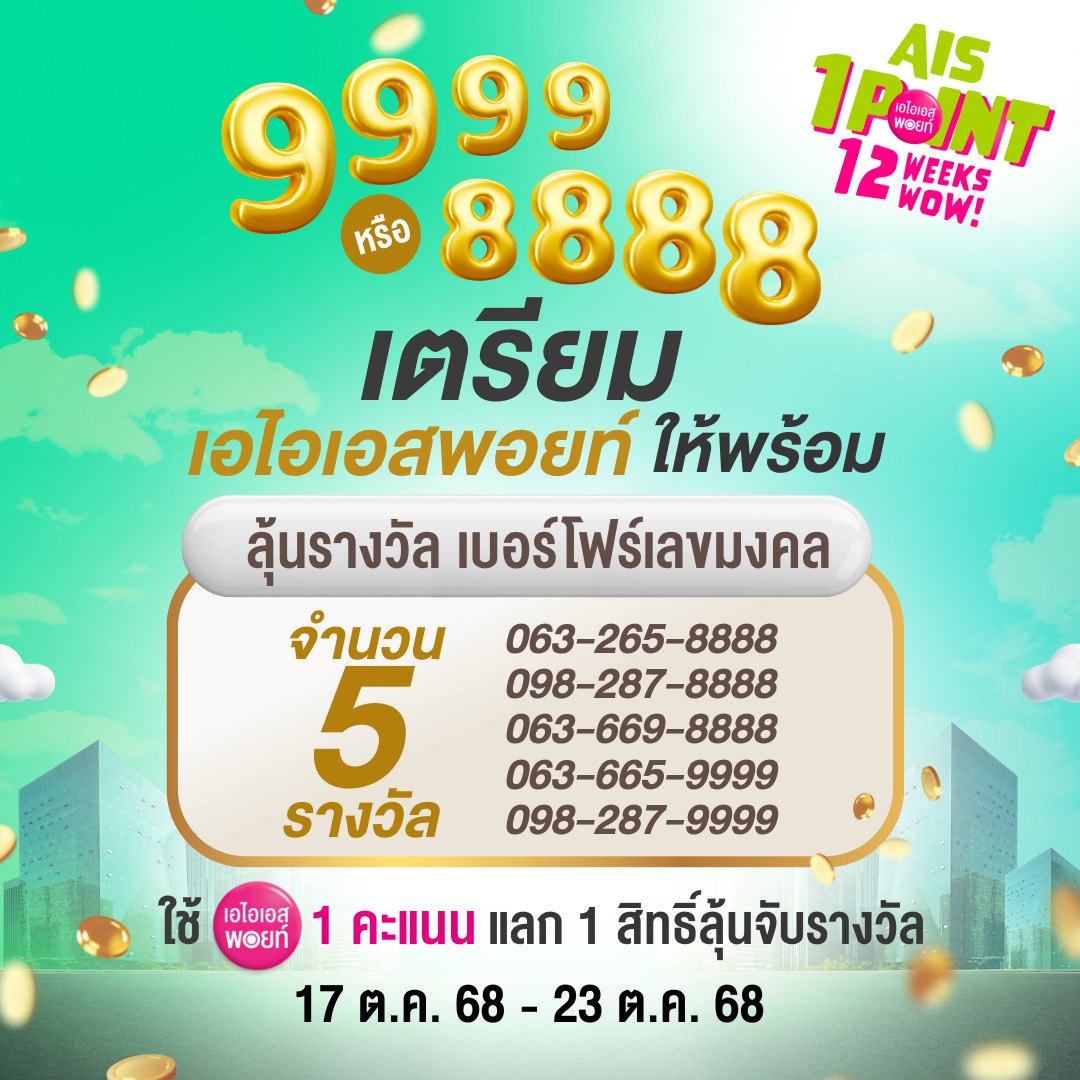 AIS ฉลอง 35 ปี จัดใหญ่แคมเปญ “1 POINT 12 WEEKS 12 WOW” แจกเบอร์โฟว์ 8888 9999 ท้ายมงคล จำนวน 5 รางวัล