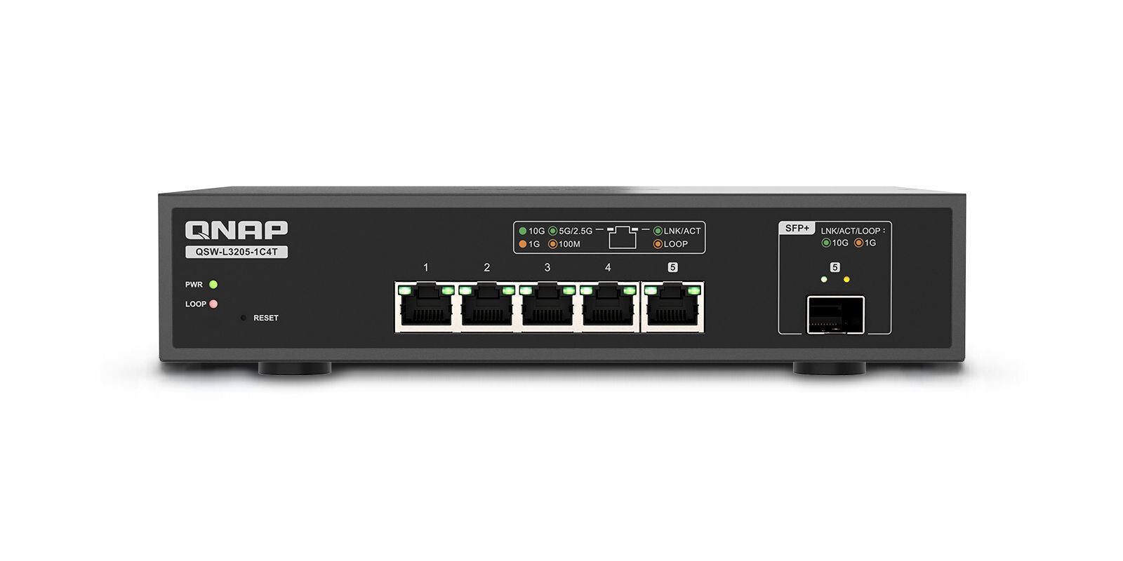 QNAP® Systems, Inc. ผู้นำด้านนวัตกรรมโซลูชันคอมพิวติ้ง เน็ตเวิร์ก และการจัดเก็บข้อมูล เปิดตัวสวิตช์รุ่นใหม่ QSW-L3205-1C4T ซึ่งเป็นสวิตช์แบบ Lite-Managed ขนาด 5 พอร์ต รองรับ 10GbE เต็มรูปแบบ ทั้ง Multi-Gig และ Fiber มาพร้อมพอร์ต RJ45 Multi-Gig 10GbE จำนวน 4 ช่อง และพอร์ต Combo SFP+/RJ45 อีก 1 ช่อง เพื่อมอบสมรรถนะเครือข่ายสูงสุดในราคาที่ประหยัดที่สุด เหมาะอย่างยิ่งสำหรับ สตูดิโอขนาดเล็กหรือครีเอเตอร์ ที่ต้องการอัปเกรดจากสวิตช์ Unmanaged เป็นระบบจัดการที่ชาญฉลาดขึ้น