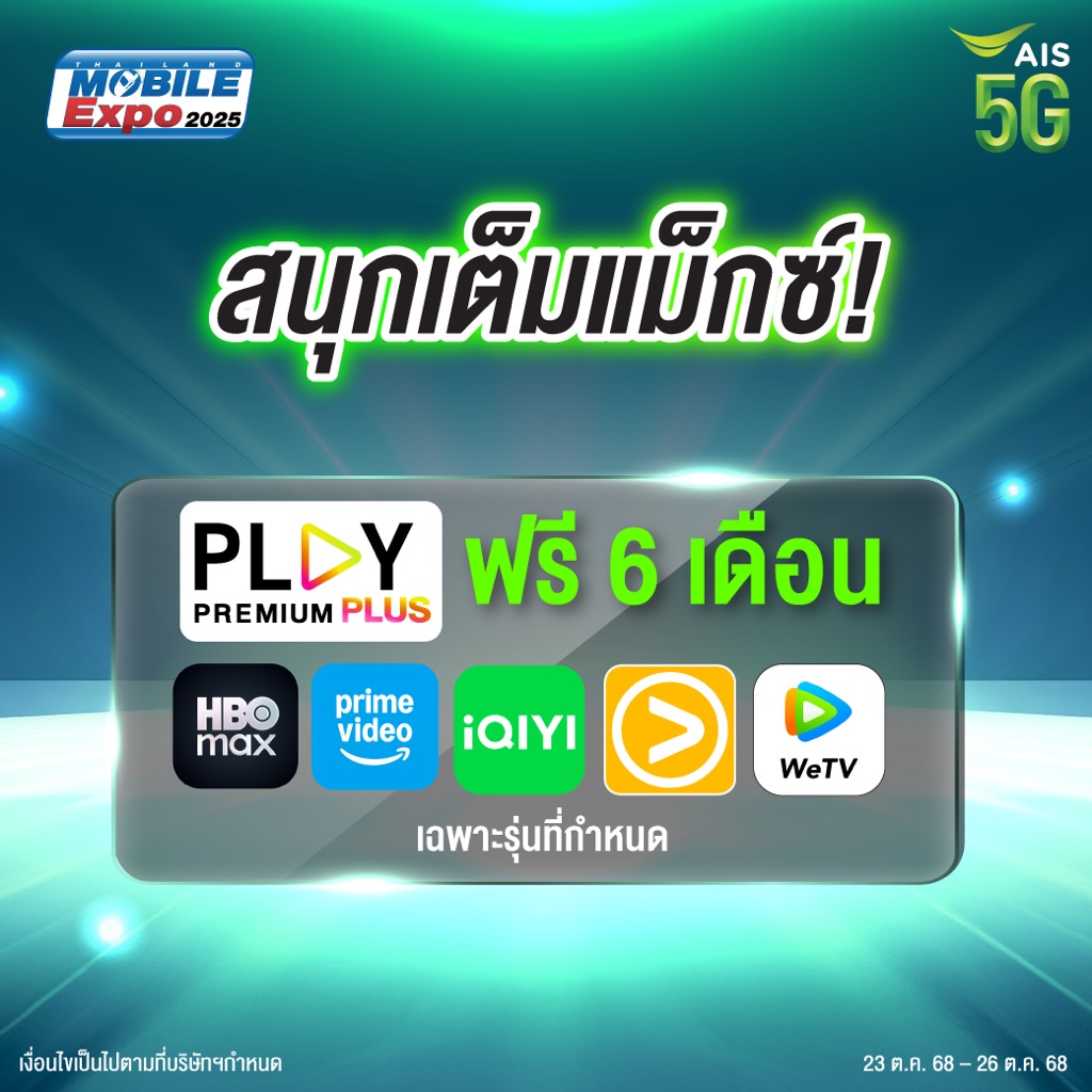 เอไอเอส ตอกย้ำการเป็นศูนย์รวมด้านดิจิทัลไลฟ์สไตล์แบบครบวงจร เติมเต็มทุกประสบการณ์ด้วยสมาร์ทโฟนและไลฟ์สไตล์ดิจิทัล พร้อมส่งมอบทุกโซลูชันส์ และความสุขส่งท้ายปี 2025 อย่างยิ่งใหญ่ ด้วยแคมเปญโปรโมชั่นสุดร้อนแรงแห่งปี ในงานมหกรรมมือถือที่ใหญ่ที่สุดในประเทศ Thailand Mobile Expo 2025 ที่จัดขึ้นระหว่างวันที่ 23 – 26 ตุลาคม 2568 ณ บูธ PL10 ศูนย์การประชุมแห่งชาติสิริกิติ์ จัดเต็มกว่าที่เคย ดีลสมาร์ทโฟนตัวท็อป อาทิ iPhone, Samsung, Xiaomi และ OPPO ลดแรงที่สุดแห่งปีสูงสุด 34,000 บาท และเนื่องในโอกาสฉลอง 35 ปี ขอมอบความว้าว เพียงใช้ AIS Points 1 คะแนน แลกรับส่วนลด 200 บาท สำหรับซื้อสินค้ากลุ่ม Gadget หรือ Accessories มูลค่า 2,000 บาท ต่อใบเสร็จ พร้อมเปิดตัวฟีเจอร์ใหม่กล้องอัจฉริยะ AiCAM และดีไวซ์สุดล้ำระดับเทพ และมากกว่าการซื้อสมาร์ทโฟน ลูกค้ายังได้รับสิทธิพิเศษชมความบันเทิงฟรี! ด้วย Entertainment Platform อย่าง AIS PLAY ที่รวมที่สุดแห่งความบันเทิงและกีฬา ดูพรีเมียร์ลีกสด ครบทุกแมตช์ นาน 3 เดือน และ Play Premium Plus สนุกเต็มแมกซ์ กับ 5 แอปดัง นาน 6 เดือน* เฉพาะรุ่นที่กำหนด เติมเต็มทั้งสมาร์ทโฟนและไลฟ์สไตล์ในแพ็กเกจเดียว พร้อมของแถมจัดเต็ม