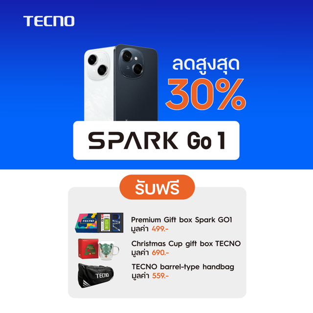 TECNO Spark Go1 จากราคาปกติ 2,099 บาท เหลือเพียง 1,853 บาท ลดทันที 246 บาท พร้อมของแถมมูลค่ารวมกว่า 1,700 บาท ได้แก่ Premium Gift Box Spark Go1 มูลค่า 699 บาท, Christmas Cup Gift Box TECNO มูลค่า 459 บาท และ TECNO Barrel-type Handbag มูลค่า 559 บาท