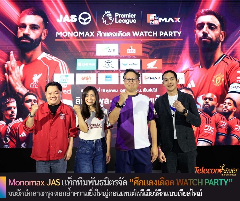 คุณนวมินทร์ ประสพเนตร ประธานเจ้าหน้าที่บริหาร บริษัท โมโน เน็กซ์ จำกัด (มหาชน) หรือ MONO , คุณวรพรรณ จันทร์เพ็ญ ประธานเจ้าหน้าที่การเงิน บริษัท จัสมิน อินเตอร์เนชั่นแนล จำกัด (มหาชน) หรือ JAS ร่วมด้วยพันธมิตร คุณวิรุฬห์ ภัทรมนัสกุล Head of Sport Sponsorship บริษัท บุญรอดเทรดดิ้ง จำกัด และ คุณรตะ โพอุทัย Senior Marketing Executive บริษัทหลักทรัพย์ วีบูลล์ (ประเทศไทย) จำกัด ถ่ายภาพร่วมกันในงาน “MONOMAX ศึกแดงเดือด WATCH PARTY” เพื่อร่วมเชียร์ศึกหยุดโลก “ลิเวอร์พูล VS แมนเชสเตอร์ ยูไนเต็ด” กันอย่างคึกคักกับบรรยากาศสุดเดือดแบบเรียลไทม์บนจอใหญ่ ณ centralwOrld LIVE ชั้น 8 เซ็นทรัลเวิลด์ เมื่อวันก่อน