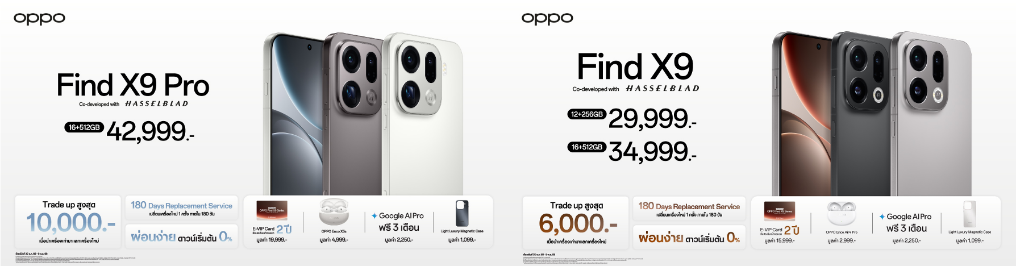 สัมผัสสมาร์ตโฟนระดับแฟลกชิป OPPO Find X9 Series สมาร์ตโฟน “ซูมดีทุกคอนเสิร์ต” ที่รวมที่สุดของเทคโนโลยีการถ่ายภาพ วิดีโอ และ AI อัจฉริยะ ไว้ในดีไซน์ที่พรีเมียมเหนือระดับ มาพร้อมระบบปฏิบัติการ ColorOS 16 ใหม่ล่าสุดที่ลื่นไหลและทรงพลังยิ่งกว่าเคย เป็นเจ้าของได้แล้ววันนี้ โดย OPPO Find X9 Pro มาพร้อมความจุ 16+512GB ใน 2 สี ได้แก่ สีขาว Silk White และสีเทา Titanium Charcoal ในราคา 42,999 บาท ส่วน OPPO Find X9 มีให้เลือกสองรุ่นความจุ 12+256GB และ 16+512GB พร้อมมีให้เลือก 2 สี ได้แก่ สีเทา Titanium Grey และสีดำ Space Black ราคาเริ่มต้นที่ 29,999 บาท เปิดจำหน่ายพร้อมกันทั่วประเทศ ณ OPPO Brand Shop ทุกสาขาและตัวแทนจำหน่ายทั่วประเทศ พร้อมโปรโมชั่นสุดพิเศษช่วงเปิดตัว