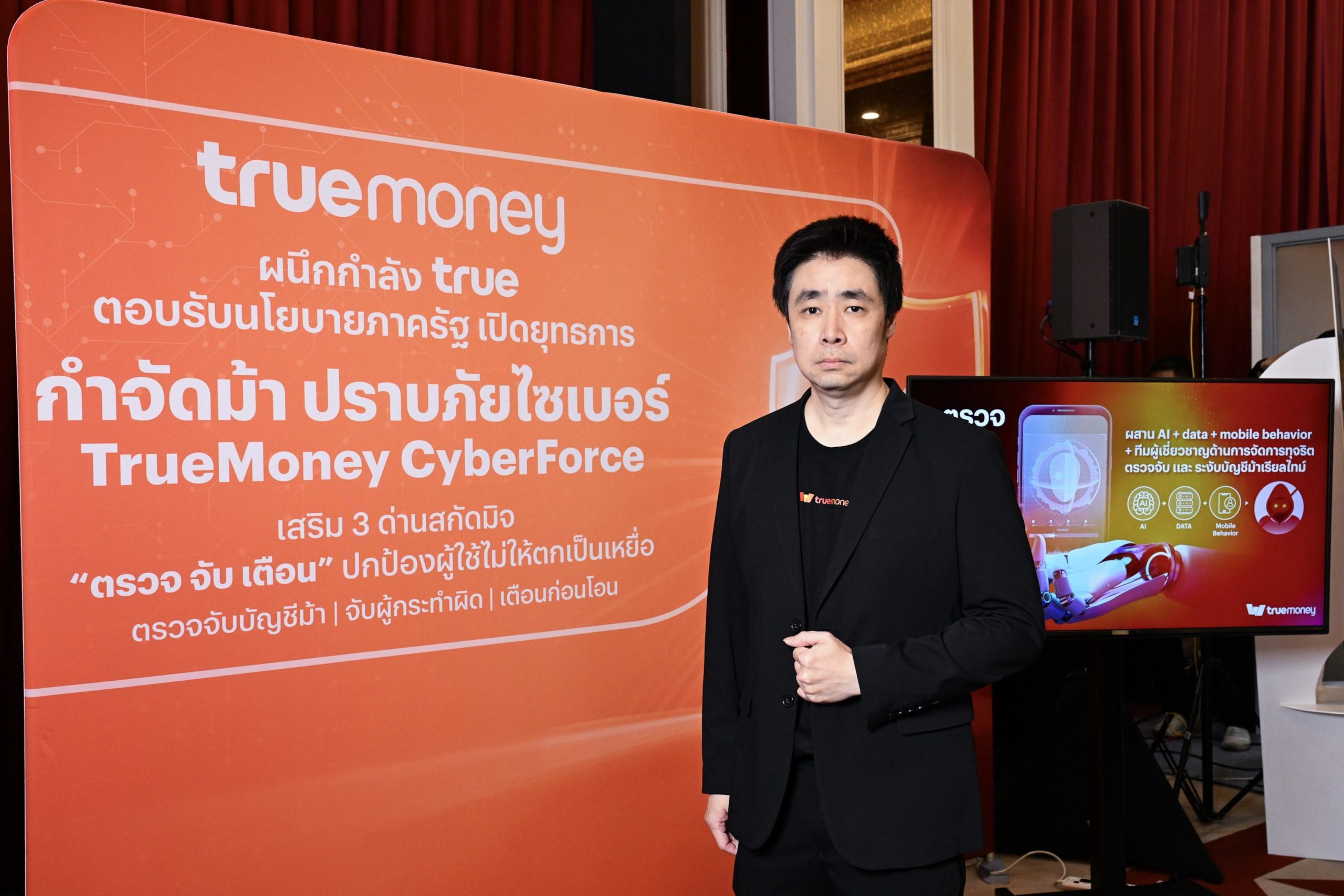 กล่าวว่า “ในฐานะผู้ให้บริการโครงสร้างพื้นฐานดิจิทัลของประเทศ กลุ่มทรูมีความมุ่งมั่นในการยกระดับความปลอดภัยทางไซเบอร์ให้กับคนไทยทุกคน และเราภูมิใจที่ได้ร่วมสนับสนุนโครงการ TrueMoney CyberForce ซึ่งเป็นความร่วมมือเชิงรุกกับ ทรูมันนี่ ในครั้งนี้ เพื่อนำข้อมูลเชิงลึกจากเครือข่ายมาใช้ตรวจจับพฤติกรรมต้องสงสัยเสริมให้การสแกนและระงับบัญชีม้ามีประสิทธิภาพมากยิ่งขึ้น นอกจากนี้ เพื่อร่วมปกป้องภัยไซเบอร์ ทรูได้ลงทุนพัฒนาบริการ True CyberSafe ที่จะตรวจสอบและเฝ้าระวังภัยคุกคามไซเบอร์พร้อมระบบแจ้งเตือนแบบเรียลไทม์ตลอด 24 ชั่วโมงโดยไม่มีค่าใช้จ่ายใด ๆ สำหรับลูกค้าทรู ดีแทค และทรูออนไลน์ทั่วประเทศ โดยไม่ต้องติดตั้งแอปเพิ่มเติม ทั้งนี้ บริการดังกล่าวใช้เทคโนโลยี AI วิเคราะห์และบล็อกลิงก์ URL โดยช่วยปกป้องลูกค้าจากการคลิกลิงก์แปลกปลอมไปแล้ว ณ วันนี้ กว่า 2.5 พันล้านครั้ง รวมทั้งมีฟีเจอร์ “Call AI Filter” ที่ช่วยคัดกรองสายเรียกเข้าที่อาจมาจากมิจฉาชีพ โดยใช้ AI ประมวลผลข้อมูลที่รวบรวมจากพฤติกรรมการใช้งานมือถือของมิจฉาชีพ และข้อมูลหมายเลขต้องสงสัยที่ได้จากตำรวจไซเบอร์รวมกว่า 300,000 หมายเลข และยังมีบริการแจ้ง 9777 บล็อกสายมิจฉาชีพ Scam Report แบบ One Stop Service ให้ประชาชนแจ้งบล็อกสายโทรเข้า SMS หลอกลวง และลิงก์อันตราย ที่ต้องสงสัย และส่งต่อข้อมูลให้เจ้าหน้าที่ตำรวจ พร้อมตอบกลับภายใน 24 ชั่วโมง ทั้งหมดนี้คือความพยายามในการร่วมสร้างสภาพแวดล้อมดิจิทัลที่ปลอดภัยและไว้วางใจได้สำหรับคนไทยอย่างแท้จริง”