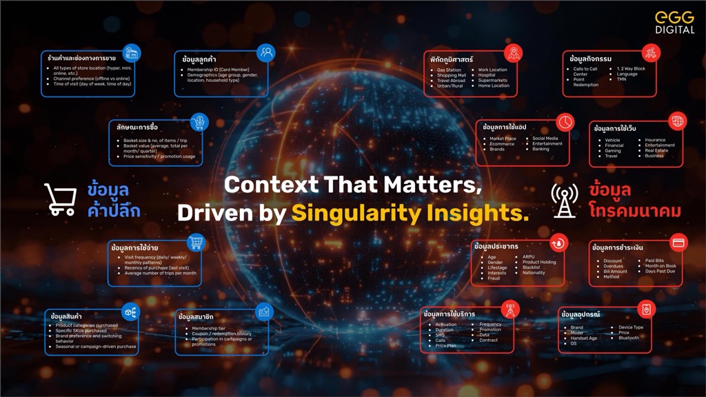 ล่าสุด บริษัทฯ จึงได้เปิดตัว ‘The Matter Suite’ แพลตฟอร์มวิเคราะห์ AI อัจฉริยะครบวงจร ที่รวม 4 โซลูชัน AI Analytics ทำหน้าที่เสมือนศูนย์ปฏิบัติการณ์ด้าน AI Analytics ที่ช่วยยกระดับการวิเคราะห์ข้อมูล ชูจุดเด่นขับเคลื่อนด้วย EGG AI Agent และข้อมูล 720 องศาจากธุรกิจรีเทลและโทรคมนาคมที่ครอบคลุมที่สุดในไทย จึงช่วยให้องค์กรธุรกิจสามารถเข้าถึง เชื่อมโยง และวิเคราะห์ข้อมูลได้ลึกและแม่นยำขึ้น มองเห็นพฤติกรรมของผู้บริโภคได้แบบ Singularity Insight เข้าใจบริบทของธุรกิจ และรวมทุกข้อมูลให้กลายเป็นหนึ่งเดียว เพื่อสร้างอินไซท์ใหม่ที่เฉียบคมและแม่นยำที่สุด ด้วย 4 โซลูชัน AI Analytics ที่ขับเคลื่อนด้วย EGG AI Agent ได้แก่ GeoMatter, MatterScoring, RetailMatter และ PromoMatter ซึ่งทุกโซลูชันสามารถนำไปใช้ได้ทั้งแบบ Self-Serve ที่ผู้ประกอบการสามารถใช้งานโซลูชันได้ด้วยตัวเอง ตอบโจทย์รวดเร็ว หรือใช้แบบ Customizable Solutions ที่ตอบโจทย์เฉพาะของแต่ละธุรกิจได้อีกด้วย”