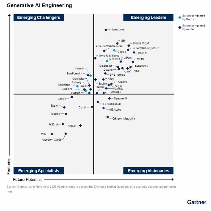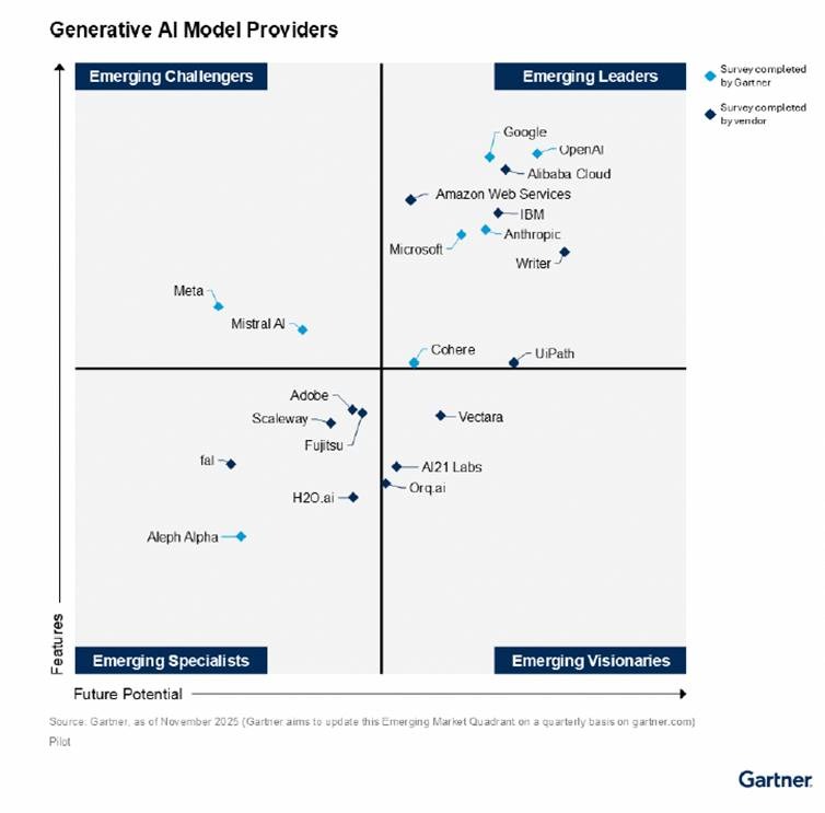 Gartner ระบุว่า Emerging Market Quadrant คือ “การจัดวางตำแหน่งผู้ให้บริการด้าน generative AI” ใน “ตลาดที่มีพลวัตและเคลื่อนไหวอย่างรวดเร็ว” และโดยทั่วไป “Emerging Leader มักเป็นผู้ให้บริการที่เป็นที่รู้จักในตลาดที่มาพร้อมคุณสมบัติต่าง ๆ ที่แข็งแกร่งและมีศักยภาพในอนาคต”