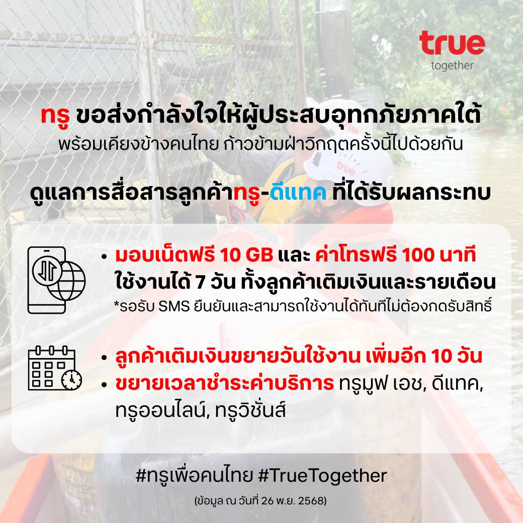 ทรู ระดมสรรพกำลัง เร่งช่วยผู้ประสบอุทกภัยพี่น้องชาวใต้ ส่งฝูงโดรน 20 ลำเสริมภารกิจ มอบถุงยังชีพ อาหาร–น้ำดื่ม–พาวเวอร์แบงค์ ดูแลการสื่อสารลูกค้าทรู–ดีแทค พร้อมเคียงข้างคนไทย ก้าวข้ามฝ่าวิกฤตครั้งนี้ไปด้วยกัน