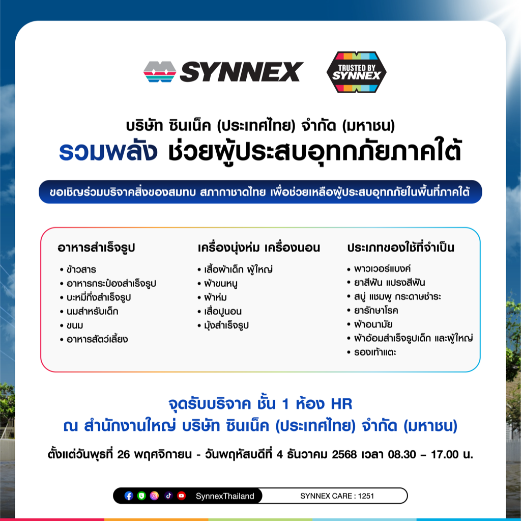 นอกจากนี้ SYNNEX ยังคงเร่งให้ความช่วยเหลืออย่างต่อเนื่อง โดยเชิญชวนประชาชนและพันธมิตรทุกภาคส่วนร่วมบริจาคอาหารและสิ่งของจำเป็น เพื่อสมทบให้สภากาชาดไทยนำไปช่วยเหลือและบรรเทาความเดือดร้อนให้แก่พี่น้องผู้ประสบอุทกภัยในพื้นที่ภาคใต้