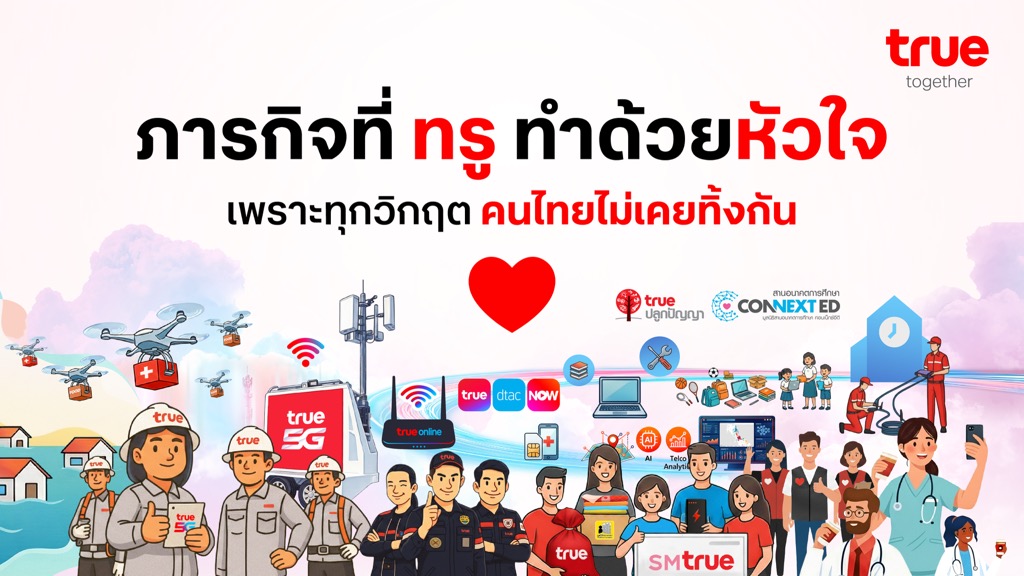 ทรู เดินหน้า “ภารกิจแห่งหัวใจ” เพื่อให้ลูกค้าคนสำคัญยังใช้งานได้อย่างต่อเนื่องแบบไร้กังวล มอบเน็ตฟรี 10GB โทรฟรี 100 นาที นาน 15 วัน พร้อมขยายวันใช้งานและขยายเวลาชำระค่าบริการทั้งแบบเติมเงินและรายเดือน ช่วยลดภาระในช่วงเวลาที่ยากลำบาก ยิ่งไปกว่านั้น ยังยกระดับความช่วยเหลือด้วยการ “ยกเว้นค่าบริการ” สำหรับลูกค้ามือถือ ทรูออนไลน์ และทรูวิชั่นส์ในพื้นที่อ.หาดใหญ่เป็นเวลา 15 วัน ขณะที่ทีมทรูออนไลน์ลุยภารกิจ “ปิดซอยซ่อม” ระดมช่างจากทั่วประเทศเข้าซ่อม เปลี่ยนอุปกรณ์ฟรีทันที พร้อมจัดเตรียม Router ใหม่กว่า 20,000 เครื่อง เพื่อให้ทุกบ้านกลับมาเชื่อมต่อได้เร็วที่สุด แบบไม่ต้องรอให้ลูกค้าแจ้งปัญหา เพราะไม่ว่าสถานการณ์จะเป็นอย่างไร ทรูพร้อมเคียงข้างลูกค้าเสมอ