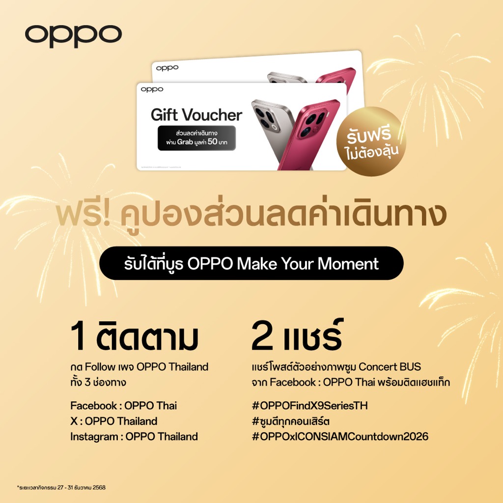 เตรียมพบกับกิจกรรมสุดพิเศษจาก OPPO ห้ามพลาดกับการเก็บภาพโมเมนต์อันน่าประทับใจ และพบกับมหาปรากฏการณ์เฉลิมฉลองส่งท้ายปีที่ยิ่งใหญ่ที่สุดของไทย  Amazing Thailand Countdown 2026 มหาปรากฏการณ์เคานต์ดาวน์ ผนึกกำลังสุดยิ่งใหญ่ สุดยอดประสบการณ์เหนือความคาดหมาย ระหว่างวันที่ 27-31 ธันวาคม 2568 นี้ ณ ริเวอร์ พาร์ค ไอคอนสยาม เท่านั้น!*ของสมนาคุณมีจำนวนจำกัด