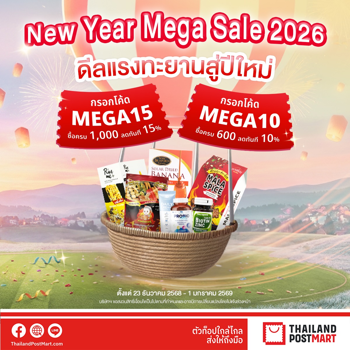 พิเศษสำหรับช่วงเทศกาลแห่งความสุข ไปรษณีย์ไทยยังเดินหน้าสนับสนุนผู้ประกอบการไทย ยกขบวนสินค้าลดกระหน่ำด้วยโปรแรง “New Year Mega Sale 2026” เพียงช้อปผ่าน ThailandPostMart ครบ 1,000 บาท รับส่วนลด 15% เมื่อกรอกโค้ด “MEGA15” และช้อปครบ 600 บาท รับส่วนลด 10% เมื่อกรอกโค้ด “MEGA10” ตั้งแต่วันนี้จนถึงวันที่ 1 มกราคม 2569 ช่วยให้ทุกการช้อปช่วงโค้งสุดท้ายก่อนปีใหม่คุ้มค่ามากกว่าที่เคย