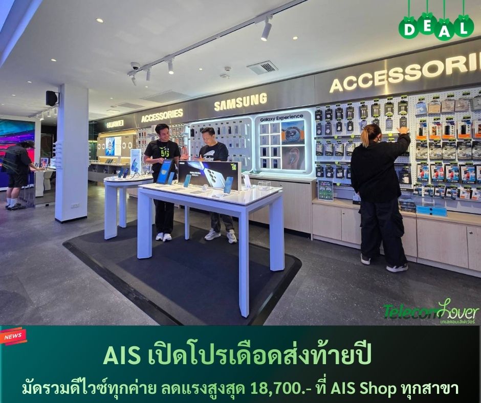 ขณะที่ฝั่ง Android ก็แรงไม่แพ้กัน นำโดย Samsung Galaxy S25 Ultra เครื่องเปล่าเริ่ม 46,900 บาท ลดทันที 10,000 บาท, Samsung Galaxy S25+ | S25 เครื่องพร้อมแพ็กเกจเริ่ม 17,900 บาท หรือเครื่องเปล่าเริ่ม 29,900 บาท ลดทันที 9,000 บาท, และ Samsung Galaxy Z Flip7 เครื่องพร้อมแพ็กเกจเริ่ม 29,700 บาท หรือเครื่องเปล่าเริ่ม 40,900 บาท ลดทันที 8,000 บาท แถม ฟรีกระเป๋า Aristotle และ AIS Care+ with Samsung Care Services ฟรี 1 ปี เสริมด้วยดีลสายแก็ดเจ็ต Huawei Watch ลดสูงสุด 4,400 บาท และโปร แลก AIS Points ลดหลักพัน สำหรับรุ่นฮิตอย่าง vivo X300 series, OPPO Find X9 series และ Redmi Note 14 series ตั้งแต่วันนี้ – 13 มกราคม 2569 ที่ AIS Shop ทุกสาขาเท่านั้น!