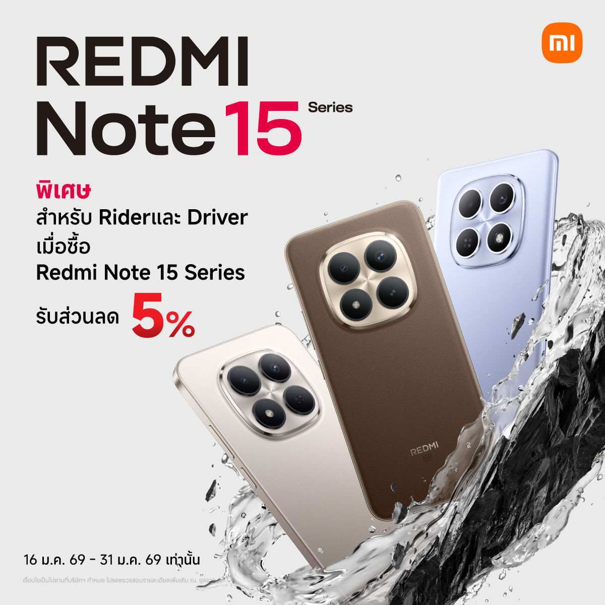 Xiaomi Thailand ประกาศมาตรการสนับสนุนกลุ่มผู้ให้บริการรับ-ส่งอาหารและผู้โดยสาร (Rider & Driver) จากแพลตฟอร์ม Grab, LINE MAN และ Bolt เพื่อส่งต่อความแข็งแกร่งในการทำงานทุกสภาวะอากาศ โดยมอบส่วนลดพิเศษ 5% ทันทีเมื่อซื้อสมาร์ตโฟนซีรีส์ล่าสุด Redmi Note 15 Series ทุกรุ่น เพียงกดรับโค้ดส่วนลดผ่านแอปพลิเคชันของผู้ให้บริการต้นสังกัดเพื่อนำมาแสดง ณ Xiaomi Store 56 สาขาที่ร่วมรายการ หรือกรอกรหัสผ่านช่องทางออนไลน์