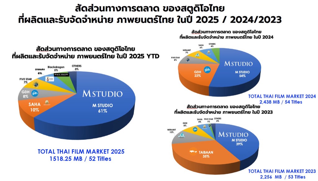 อุตสาหกรรมภาพยนตร์ไทยเตรียมเข้าสู่ยุคทองในปี 2569 โดยมี M STUDIO เป็นหัวหอกสำคัญในการขับเคลื่อน หลังจากโชว์ฟอร์มแกร่งครองแชมป์ Box Office ติดต่อกันถึง 3 ปีซ้อน และในปี 2568 ที่ผ่านมาสามารถทำรายได้รวมจากการจัดจำหน่ายหนังไทยสูงถึง 930.9 ล้านบาท หรือคิดเป็นสัดส่วนกว่า 61% ของมูลค่าตลาดรวมทั้งหมด ตอกย้ำความเป็นเบอร์หนึ่งในตลาดอย่างเหนียวแน่น