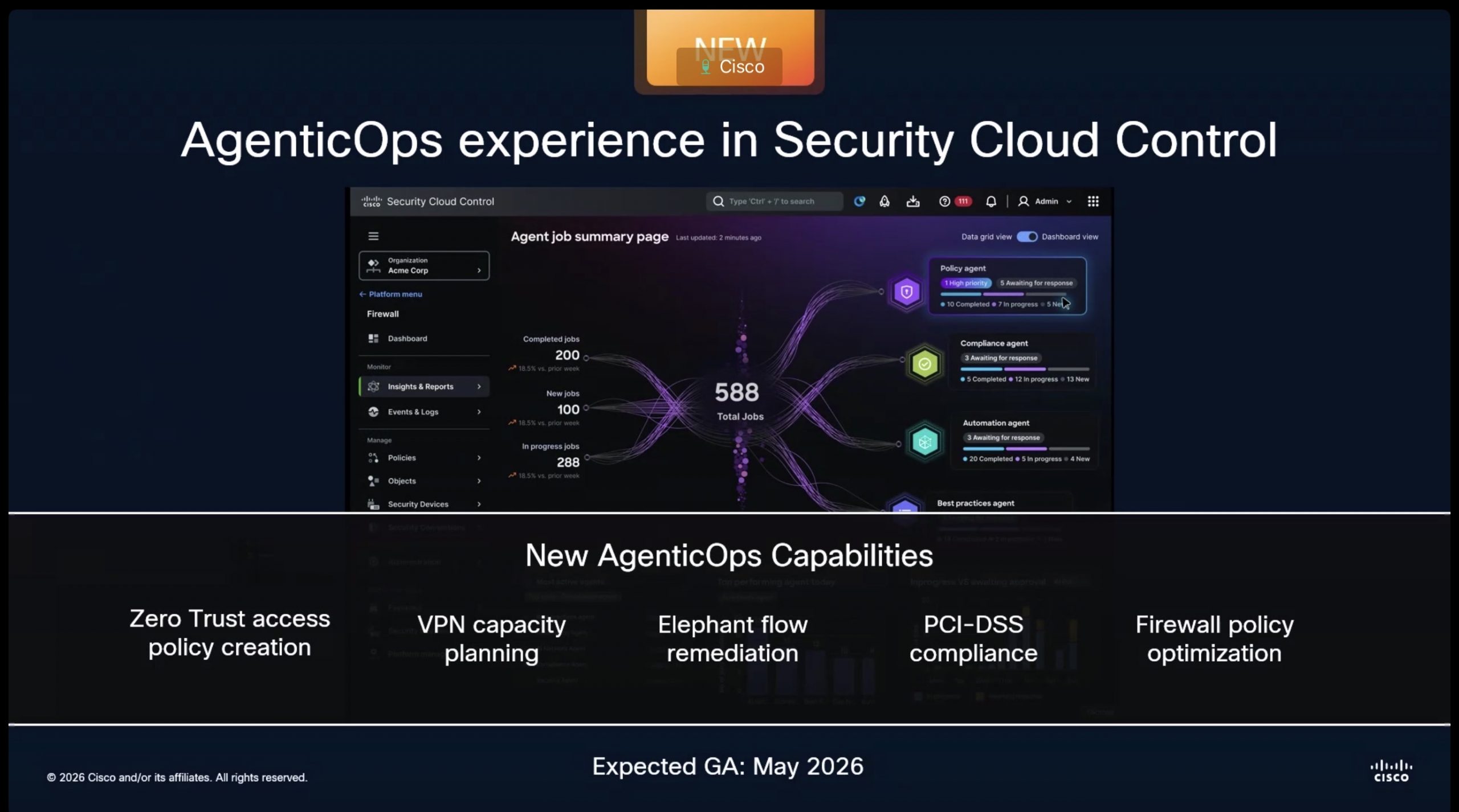 ภายใน Security Cloud Control ความสามารถ AgenticOps จะรองรับงานสำคัญ เช่น Zero Trust policy creation, VPN capacity planning, Elephant flow remediation, PCI-DSS compliance และ Firewall policy optimization โดยระบุ Expected GA: May 2026