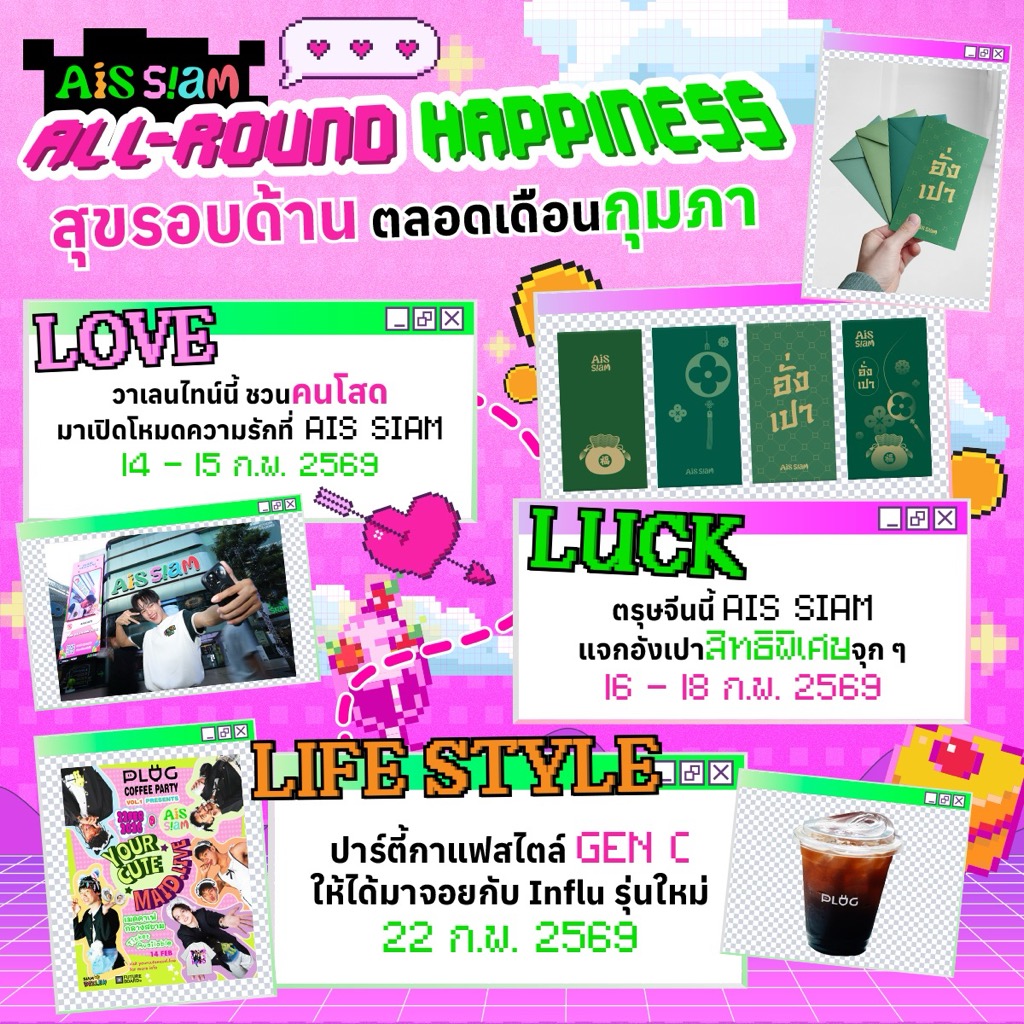 AIS SIAM คอมมูนิตี้สเปซเจนซีใจกลางสยาม พื้นที่ของคนชอบเล่น จนได้เป็นตัวจริงต้อนรับความสุขตลอดเดือนกุมภาพันธ์นี้ พร้อมวัยรุ่น Gen-C (Creative Generation) เตรียมพลังความครีเอทีฟแล้วออกมาปักหมุดที่ AIS SIAM จุดนัดพบใจกลางสยามที่รวมทุกไลฟ์สไตล์ไว้ในที่เดียว ให้ทุกคนมาสร้างโมเมนต์ใหม่ๆ ที่แชร์ได้จริง คอนเทนต์ปังได้ทุกมุม ไม่ว่าจะสายรัก สายมู หรือสายปาร์ตี้ เพราะเดือนนี้ AIS SIAM มีให้ครบแบบจัดเต็มกับ 3 ไฮไลท์กิจกรรมใหญ่ตลอดเดือน ทั้ง LOVE เทศกาลวาเลนไทน์, LUCK เทศกาลตรุษจีน, และ LIFESTYLE ปาร์ตี้กาแฟรูปแบบใหม่กับ 5 อินฟลูเอนเซอร์รุ่นใหม่ชื่อดัง โดยเริ่มที่