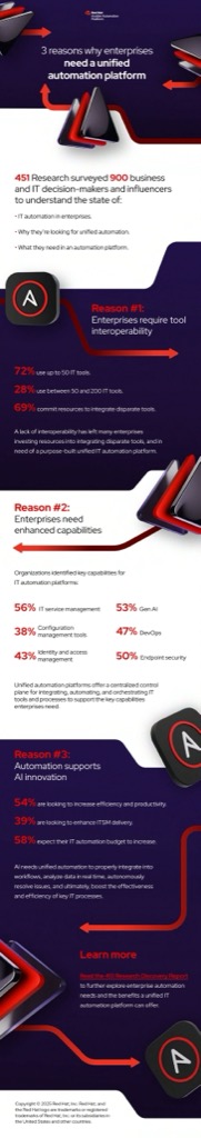 รายงาน 451 Research ชูแนวคิดเรื่องแพลตฟอร์มระบบอัตโนมัติไอทีแบบรวมศูนย์ (unified IT automation platform) ซึ่งทำหน้าที่เป็นศูนย์กลางในการควบคุม โดยใช้ระบบอัตโนมัติเข้ามาบูรณาการ จัดระเบียบครื่องมือ กระบวนการ และทรัพยากรด้านไอทีทั้งหมดขององค์กรให้ทำงานร่วมกันอย่างเป็นระบบโดยอัตโนมัติ