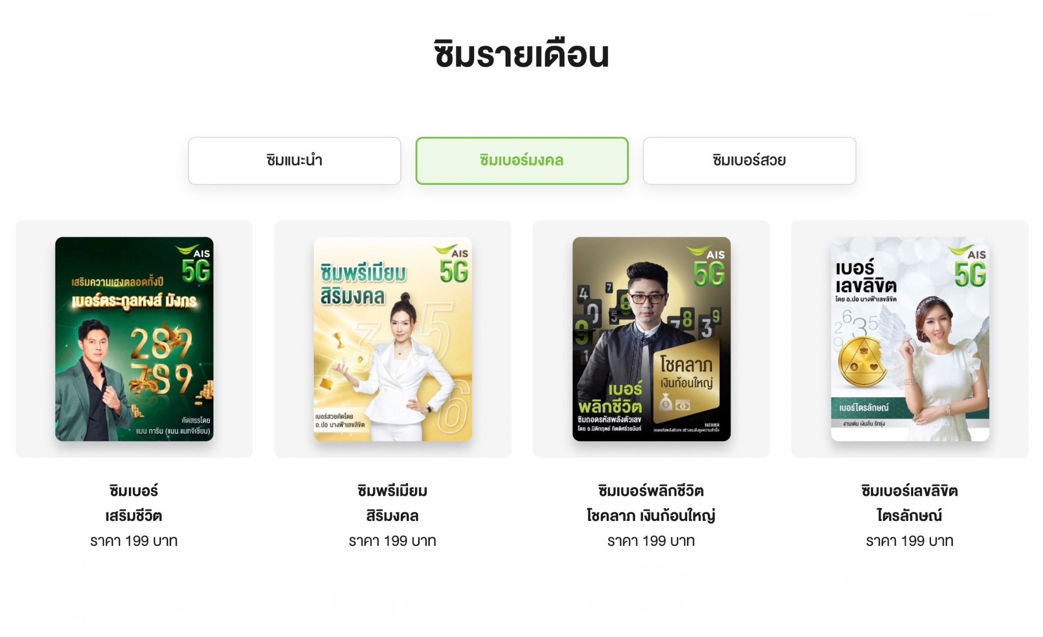 ผู้ที่สนใจสามารถเลือกซื้อเบอร์มงคลพร้อมสมัครแพ็กเกจได้ที่ AIS Shop ทุกสาขา, ร้านเทเลวิซ และตัวแทนจำหน่ายทั่วประเทศ หรือสั่งซื้อออนไลน์ส่งฟรีถึงบ้านผ่าน AIS Online Store โดยมีราคาเริ่มต้นของซิม 199 บาท และ แพ็ก AIS 5G รายเดือนเริ่ม 599 บาท สามารถตรวจสอบรายละเอียดเงื่อนไขและแพ็กเกจที่เหมาะกับการใช้งานได้ตามช่องทางของ AIS (สั่งซื้อออนไลน์: https://m.ais.co.th/PostpaidLuckynumber)