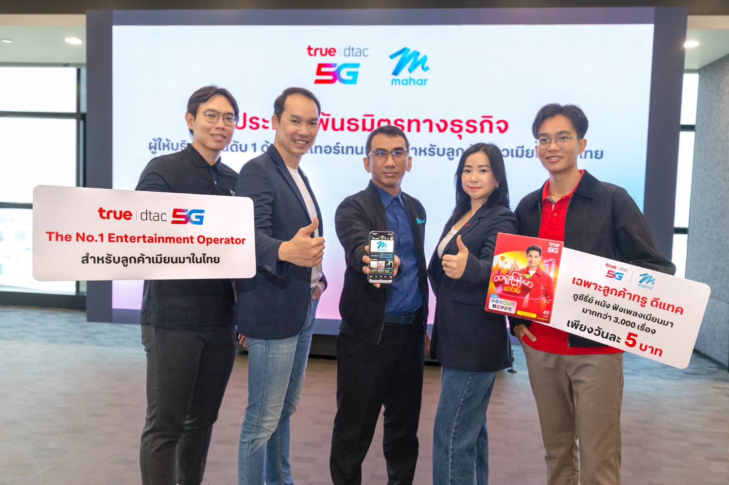 สำหรับชาวเมียนมา กว่า 4 ล้านคน ที่อาศัย และทำงานอยู่ในประเทศไทย “บ้าน” อาจอยู่ห่างไกล แต่ความผูกพันกับภาษา และละครจากบ้านเกิดยังคงอยู่เสมอ ทรู 5G โดย คุณภูริโชติ วงศ์โกมลเชษฐ์ หัวหน้าฝ่ายบริการดิจิทัล บมจ. ทรู คอร์ปอเรชั่น และ คุณรษิกา สถีระนาวิน หัวหน้าฝ่ายการตลาดกลุ่มคนเข้าเมือง นักท่องเที่ยว และนักเรียน ตอกย้ำความมุ่งมั่นในการเป็นเครือข่ายอันดับ 1 พร้อมเป็นผู้นำด้านความบันเทิง ที่ครองใจผู้ใช้งานชาวเมียนมาในประเทศไทย จึงประกาศความร่วมมือครั้งสำคัญกับ Mahar (มะหะ) โดย คุณ วิน ไคล์ ( Mr. Win Khine) ผู้ก่อตั้งและประธานเจ้าหน้าที่บริหาร แอปพลิเคชันความบันเทิงยอดนิยมอันดับหนึ่งจากประเทศเมียนมา เพื่อส่งมอบประสบการณ์ดิจิทัลที่ช่วยคลายความคิดถึงบ้านด้วยคอนเทนต์ยอดนิยมที่ส่งตรงจากบ้านเกิดสู่หน้าจอสมาร์ทโฟนในไทย เป็นครั้งแรกและรายเดียวในประเทศ