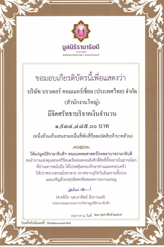 บริษัท บราเดอร์ คอมเมอร์เชี่ยล (ประเทศไทย) จำกัด นำโดย นายธีรวุธ ศุภพันธุ์ภิญโญ กรรมการผู้จัดการ พร้อมด้วย นายกิตติพงศ์ กนกวิไลรัตน์ ผู้จัดการทั่วไปฝ่ายขายและการตลาด นายพรภัค อุไพศิลป์สถาพร ผู้จัดการทั่วไปฝ่ายการเงินและการบริหาร และนางสาวรัสสิญากร ตัณฑวณิชย์ ผู้จัดการทั่วไปฝ่ายบริการลูกค้า ร่วมส่งมอบเงินบริจาคโดยไม่หักค่าใช้จ่ายจากการจัดกิจกรรมวิ่งการกุศลประจำปี Brother Beat Cancer Run 2026 เป็นจำนวนเงินรวมทั้งสิ้น 1,934,485 บาท ซึ่งถือเป็นยอดบริจาคสูงสุดเป็นประวัติการณ์ เพื่อนำไปช่วยเหลือผู้ป่วยมะเร็งที่ขาดแคลนทุนทรัพย์ผ่านมูลนิธิรามาธิบดี กองทุนมะเร็งโลหิตวิทยาผู้ใหญ่ โรงพยาบาลรามาธิบดี สอดคล้องกับพันธกิจสากล Golden Ring Project ของ Brother ประเทศญี่ปุ่นและตอกย้ำปรัชญา At your side ที่มุ่งหวังยกระดับคุณภาพชีวิตและมอบโอกาสในการเข้าถึงยารักษาที่มีประสิทธิภาพให้แก่ผู้ป่วยมะเร็งยากไร้ในสังคมไทย โดยมี รศ.นพ.สุภร จันท์จารุณี และ รศ.พญ.พิมพ์ใจ นิภารักษ์ ผู้แทนจากมูลนิธิรามาธิบดี กองทุนมะเร็งโลหิตวิทยาผู้ใหญ่ โรงพยาบาลรามาธิบดี เป็นผู้รับมอบ ณ บริเวณเชิงสะพานพระราม 8 (ฝั่งอรุณอัมรินทร์)