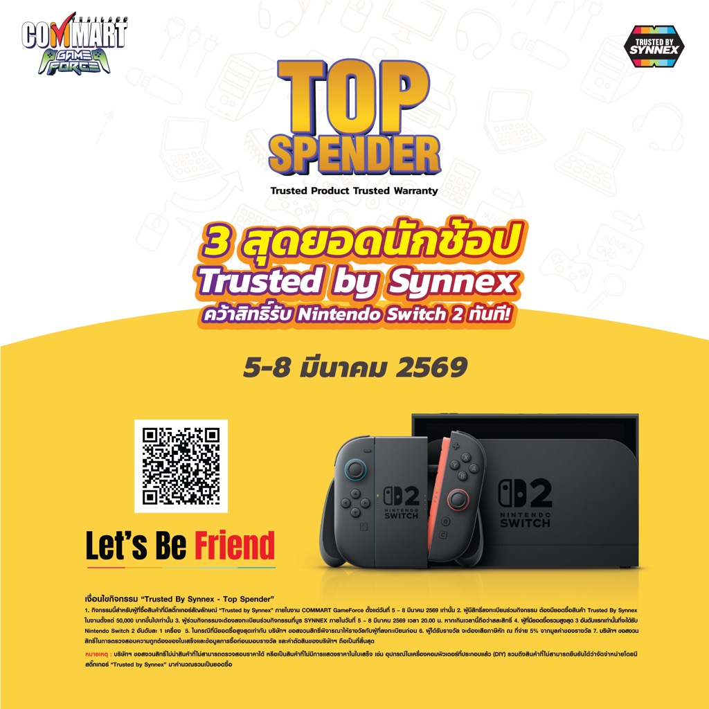 พิเศษสุด! กับกิจกรรม “Trusted By Synnex – Top Spender” ช้อปมากกว่าใคร SYNNEX มอบ Nintendo Switch 2 ให้เลย สำหรับผู้ที่มียอดซื้อสินค้าไอทีที่มีสติ๊กเกอร์ Trusted By Synnex ในงาน COMMART GAME FORCE สูงสุด 3 อันดับแรก ตลอดระยะเวลาการจัดงาน
