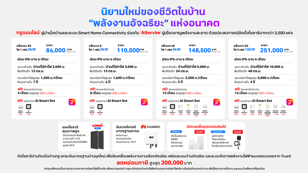 พบกับราคาพิเศษผ่อนเริ่มต้นเพียง 1,648 บาทต่อเดือน พร้อมบริการสินเชื่อ ผ่อนนานสูงสุด 7 ปีและยังได้รับสิทธิ์ในการลดหย่อนภาษีสูงสุด 200,000 บาทไปพร้อมกันอีกด้วย เพื่อมอบความคุ้มค่าสูงสุดให้ครัวเรือนไทยได้เริ่มต้นชีวิตยุคใหม่ในบ้านพลังงานอัจฉริยะที่ยั่งยืน ทรูออนไลน์และ Altervim พร้อมแล้วที่จะเป็นจิ๊กซอว์ชิ้นสำคัญในการเชื่อมโยงเทคโนโลยีอินเทอร์เน็ต อุปกรณ์สมาร์ทดีไวซ์ และพลังงานสะอาด ให้กลายเป็นเนื้อเดียวกันเพื่อคุณภาพชีวิตที่ดีกว่าของคนไทย