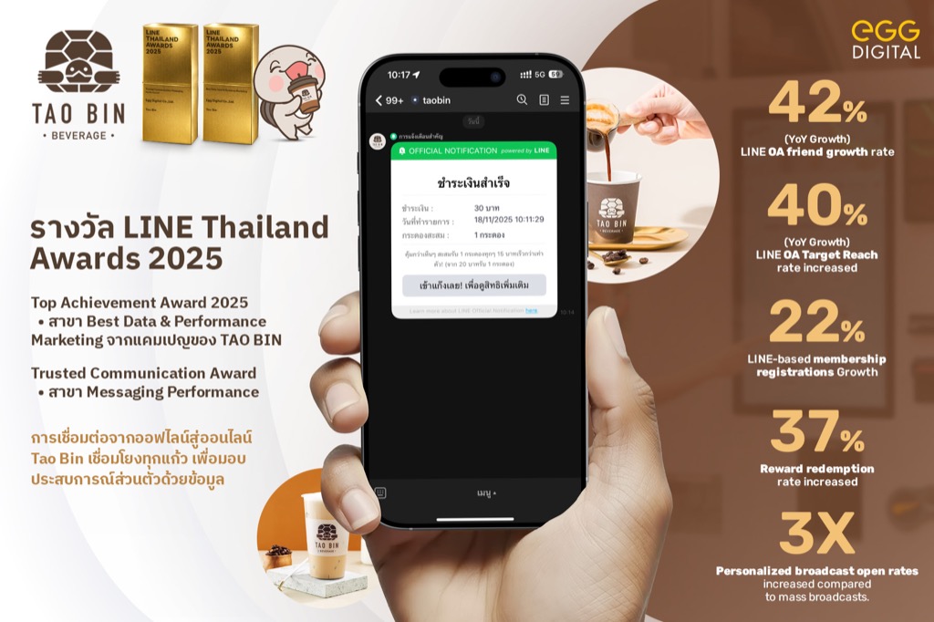เอ้ก ดิจิทัล เปลี่ยนตู้เต่าบินให้กลายเป็นเครื่องมือเก็บข้อมูลที่ชาญฉลาดผ่านแคมเปญ TAO BIN Bridges Every Cup to Personalize Experience with Data โดยใช้กลยุทธ์ Offline-to-On ‘LINE’ Connection เพื่อยกระดับศักยภาพของระบบ CRM จากเดิมที่สื่อสารได้เพียงเบอร์โทรหน้าตู้ ไม่สามารถติดตามพฤติกรรมลูกค้าเชิงลึก และกระตุ้นการซื้อซ้ำได้อย่างมีประสิทธิภาพ เอ้ก ดิจิทัลจึงเชื่อมต่อระบบ CRM กับ LINE OA ผ่าน LINE Login และ LON ทำให้สามารถเก็บ LINE User ID และเชื่อมต่อข้อมูลลูกค้าได้อย่างเป็นระบบ พร้อมนำข้อมูลจาก CRM และพฤติกรรมการซื้อไปใช้ต่อยอดได้อย่างมีประสิทธิภาพจริงมาวิเคราะห์และสร้าง Customer Segmentation เพื่อออกแบบการสื่อสารแบบ Personalized Communication ช่วยในการแจ้งเตือนคะแนนกระดองสะสมและการชำระเงินสำเร็จ เพื่อสร้างประสบการณ์ที่น่าประทับใจ และให้ลูกค้าสะสมคะแนนได้อย่างสะดวกสบาย ส่งผลให้เกิด Engagement และยอดขายที่วัดผลได้จริง ส่งผลให้จำนวน LINE OA Friends เติบโต 42%, LINE OA Target Reach Rate เพิ่มขึ้น 40%, Reward Redemption Rate เพิ่มขึ้น 37% และ Personalized Broadcast Open Rate สูงกว่า Mass Broadcast ถึง 3 เท่า