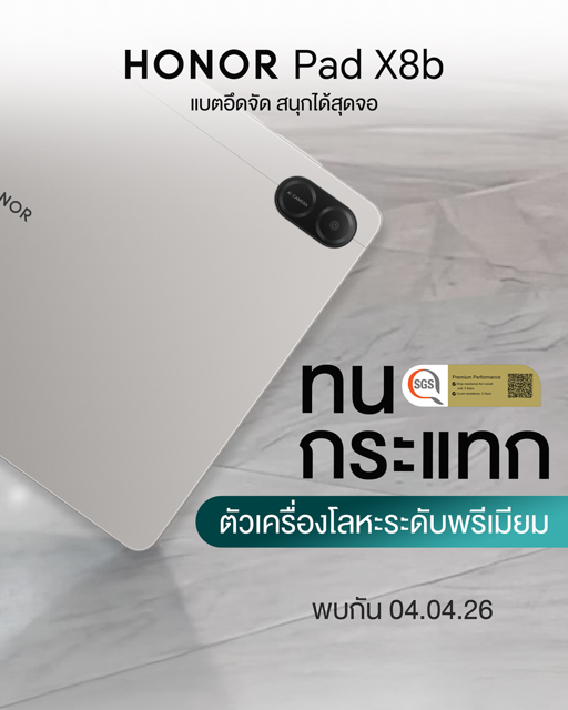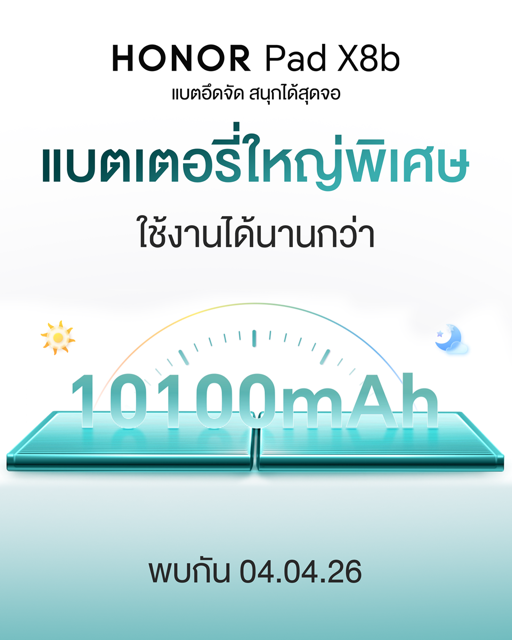 ออเนอร์ (HONOR) ผู้นำด้านอุปกรณ์อัจฉริยะระดับโลก เดินหน้าเขย่าตลาดแท็บเล็ตอีกครั้งด้วยการเตรียมเปิดตัว HONOR Pad X8b ชูคอนเซปต์ “แบตอึดจัด สนุกได้สุดจอ”                  ที่ผสานทั้งดีไซน์พรีเมียมและประสิทธิภาพไว้อย่างลงตัว เพื่อตอบโจทย์การใช้งานในทุกมิติ ไม่ว่าจะเป็นนักเรียน นักศึกษา คนทำงานรุ่นใหม่ หรือสายฟรีแลนซ์ที่ต้องการอุปกรณ์คู่ใจเพียงเครื่องเดียว ครบทั้งเรียน ทำงาน               และความบันเทิง โดดเด่นด้วยหน้าจอ HONOR Eye Comfort FullView ขนาด 11 นิ้ว เสริมความอึดด้วยแบตเตอรี่ความจุ 10,100mAh ที่พร้อมลุยได้ตลอดวัน พร้อมโครงสร้างตัวเครื่องโลหะระดับพรีเมียม แข็งแรงทนทาน ผ่านการรับรองมาตรฐานความแกร่งระดับ 5 ดาวจาก SGS ประเทศสวิตเซอร์แลนด์ เตรียมเผยราคาอย่างเป็นทางการในประเทศไทยวันที่ 4 เมษายน 2569 พร้อมรับโปรโมชันและข้อเสนอพิเศษมากมาย