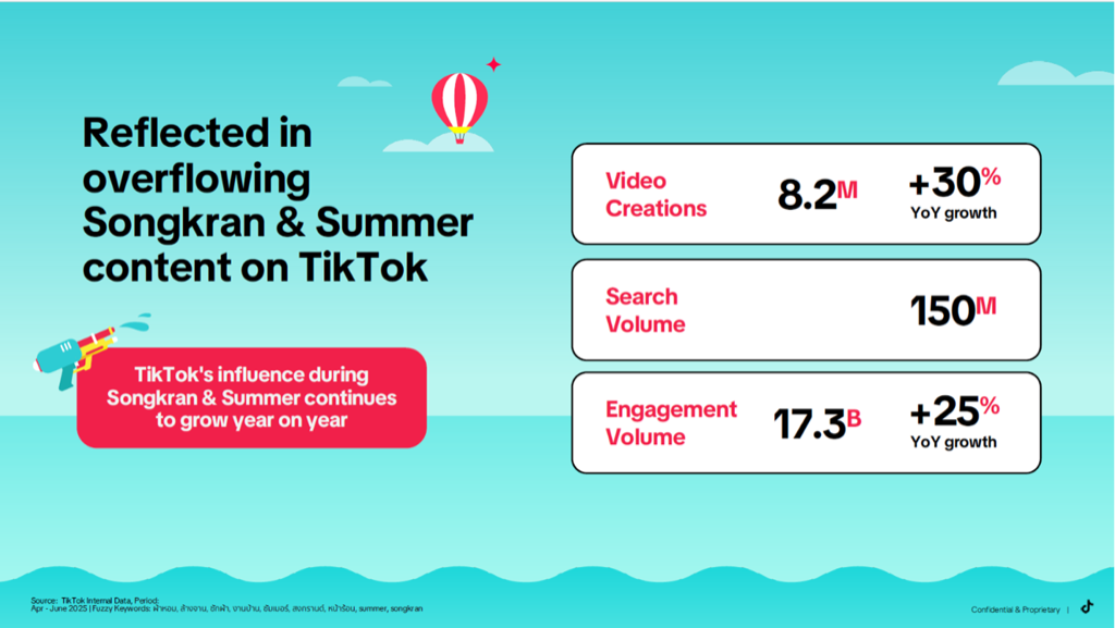 จากอินไซต์ของ TikTok แน่นอนว่า ที่เคยมองว่าสงกรานต์เป็นเพียงช่วงเวลา Peak สั้น ๆ ได้ถูกนิยามใหม่ในปี 2026 สู่การเป็น Sustained Seasonal Economy ที่เติบโตอย่างต่อเนื่องและมั่นคง และได้เปลี่ยน Consumer Journey ของคนไทยให้เป็นวัฏจักรที่ลื่นไหลระหว่างการค้นพบสิ่งใหม่และการเข้าไปมีส่วนร่วมอย่างสร้างสรรค์ ด้วยการเติบโตอย่างแข็งแกร่งของการสร้างคอนเทนต์ การค้นหา และการมีส่วนร่วมบนแพลตฟอร์ม TikTok ได้ทรานส์ฟอร์มเป็น Digital Town Square พื้นที่ที่วัฒนธรรมและความโดดเด่นตลอดซัมเมอร์ของไทยถูกร่วมสร้างขึ้นมา และทำหน้าที่เป็น Pulse of Summer ที่สะท้อนทิศทางความต้องการของผู้บริโภคได้อย่างแม่นยำ