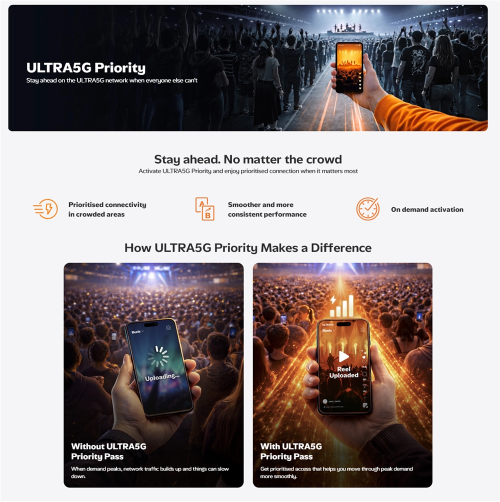 สำหรับรายละเอียดของการเปิดตัวในครั้งนี้ U Mobile ได้ผนวกสิทธิ์การใช้งาน ULTRA5G Priority เข้ากับแพ็กเกจกลุ่ม ULTRA Postpaid ไม่ว่าจะเป็นราคา 45, 68 หรือ 98 ริงกิต โดยผู้ใช้งานจะได้รับสิทธิ์การกดใช้งาน (Priority Pass) จำนวน 1-3 สิทธิ์ต่อรอบบิล แตกต่างกันไปตามแพ็กเกจ ซึ่งแต่ละสิทธิ์จะสามารถดึงศักยภาพของเครือข่าย 5G มาใช้งานเป็นกรณีพิเศษได้ต่อเนื่องนาน 3 ชั่วโมงต่อครั้ง บริการนี้มุ่งเน้นไปที่การตอบโจทย์ผู้บริโภคที่ต้องการความมั่นใจในคุณภาพสัญญาณขั้นสุดในช่วงเวลาที่สำคัญ โดยสามารถกดรับสิทธิ์ได้อย่างสะดวกผ่านแอปพลิเคชัน MyUMobile ของทางค่าย
