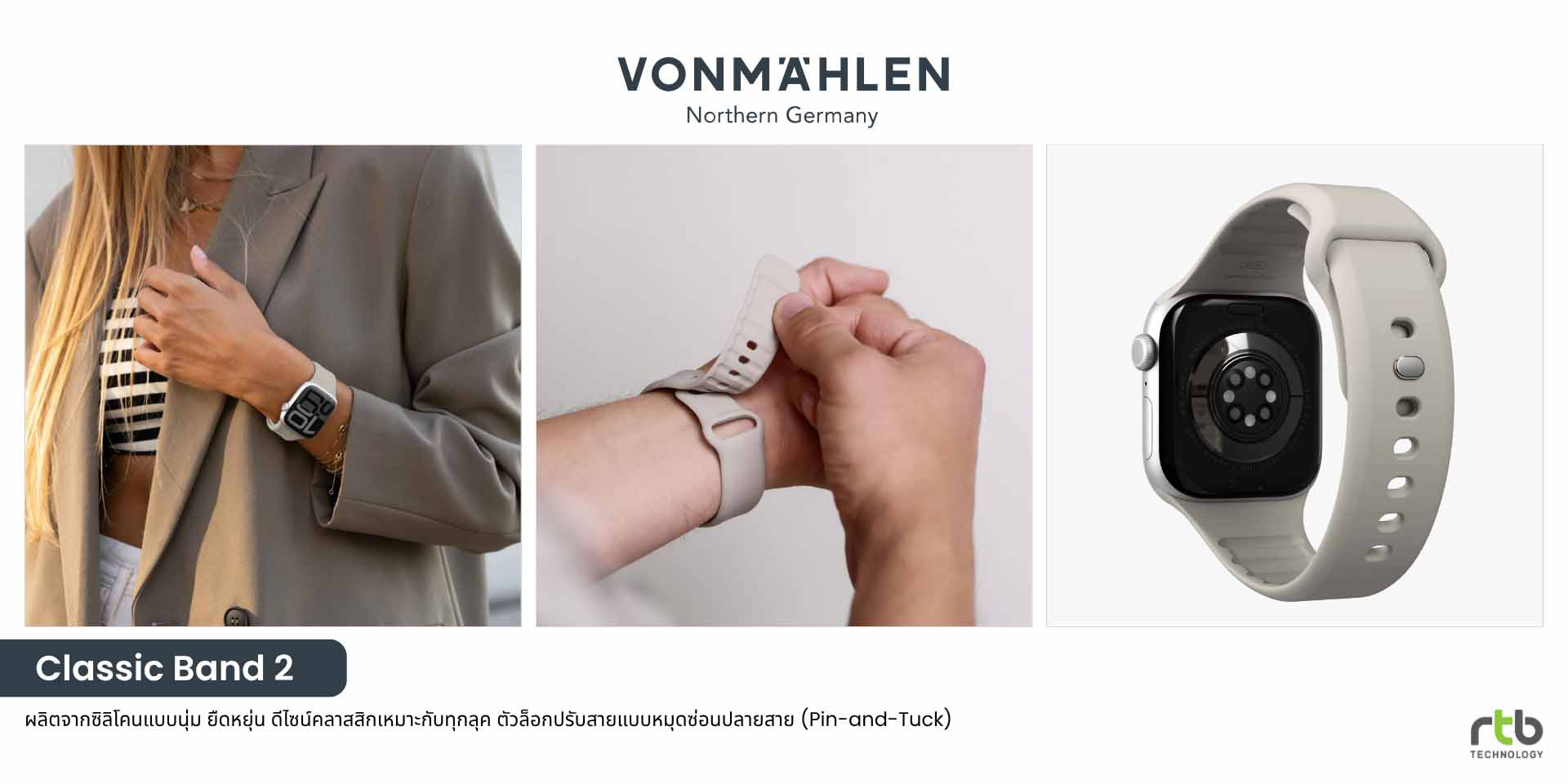 • VONMÄHLEN Classic Band 2สายสำหรับ Apple Watch ดีไซน์คลาสสิกที่ผสานความเรียบหรูและฟังก์ชันการใช้งานอย่างลงตัว ผลิตจากซิลิโคนรีไซเคิลคุณภาพสูง ผิวเรียบนุ่ม ยืดหยุ่น และไม่ระคายเคืองผิว มาพร้อมช่องระบายอากาศด้านใน ช่วยให้อากาศไหลเวียนได้ดียิ่งขึ้น ลดความร้อนและเหงื่อสะสม ทำให้ข้อมือแห้งสบายตลอดทั้งวัน เหมาะสำหรับการใช้งานในชีวิตประจำวันและไลฟ์สไตล์สายแอคทีฟ ตัวล็อกแบบหมุดซ่อนปลายสาย (Pin-and-Tuck) ช่วยให้สวมใส่ได้กระชับและปรับขนาดได้ง่าย รองรับ Apple Watch ขนาด 40/41/42mm และ 44/45/46/49mm มีให้เลือก 3 สี ได้แก่ Black, Navy และ Cream วางจำหน่ายในราคา 890 บาท