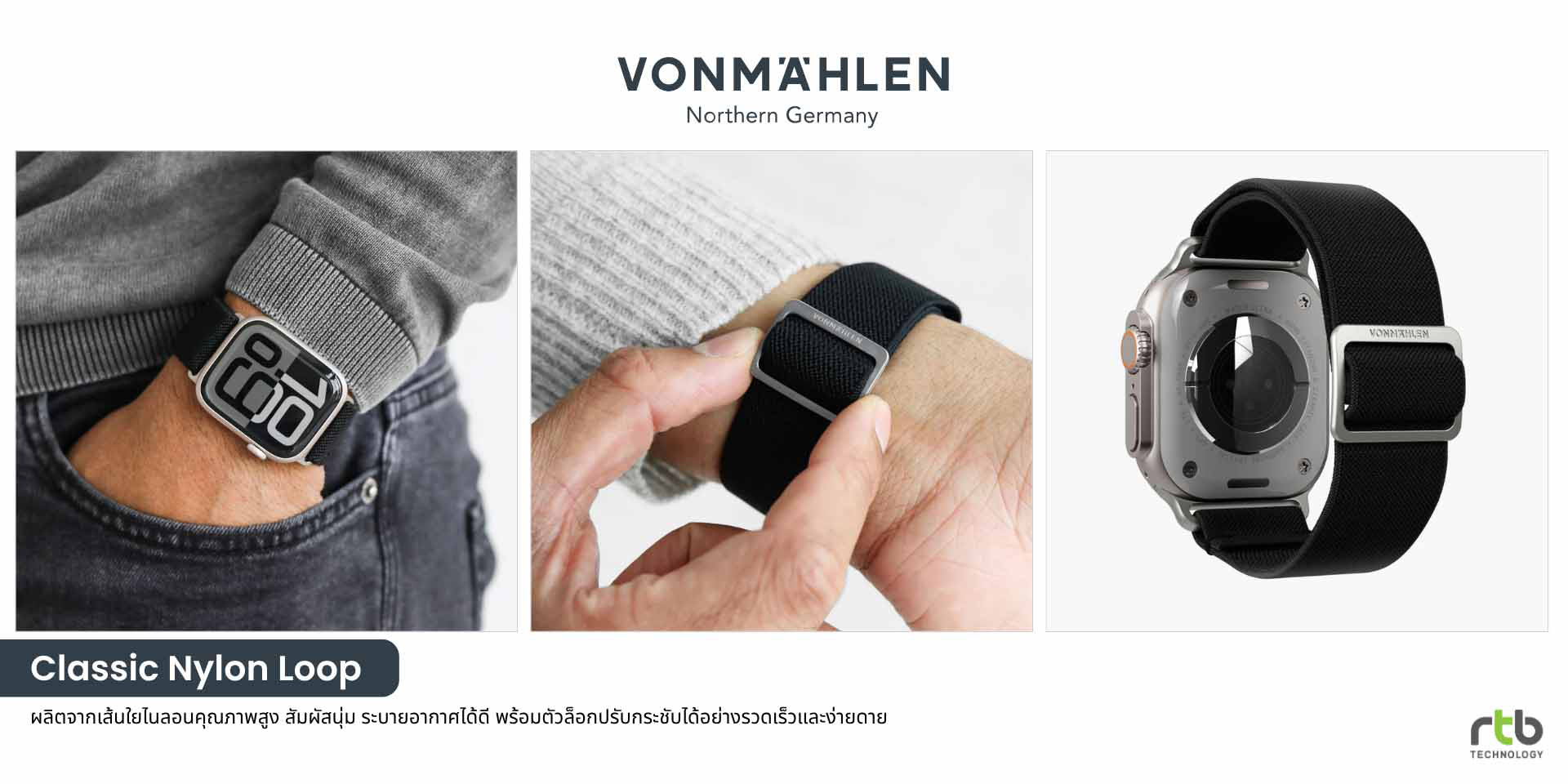 • VONMÄHLEN Classic Nylon Loopสายสำหรับ Apple Watch ที่ออกแบบมาเพื่อความสบายในการสวมใส่ตลอดทั้งวัน ผลิตจากวัสดุไนลอนที่ยืดหยุ่นและนุ่มเป็นพิเศษ ช่วยระบายอากาศและความร้อนได้ดี ทำให้ข้อมือแห้งสบาย ไม่อับชื้น เหมาะสำหรับทุกกิจกรรมในชีวิตประจำวัน พร้อมเติมเต็มทุกสไตล์ไม่ว่าจะเป็นลุคแคชวลหรือทางการ มาพร้อมตัวล็อกแบบเลื่อนที่ช่วยให้ปรับขนาดสายได้ง่ายและกระชับพอดีกับข้อมือ รองรับ Apple Watch ขนาด 40/41/42mm และ 44/45/46/49mm มีให้เลือกหลายสี ได้แก่ Black, All Black, Cream, Cream Black, Navy, Navy Black, Olive และ Olive Black วางจำหน่ายในราคา 890 บาท