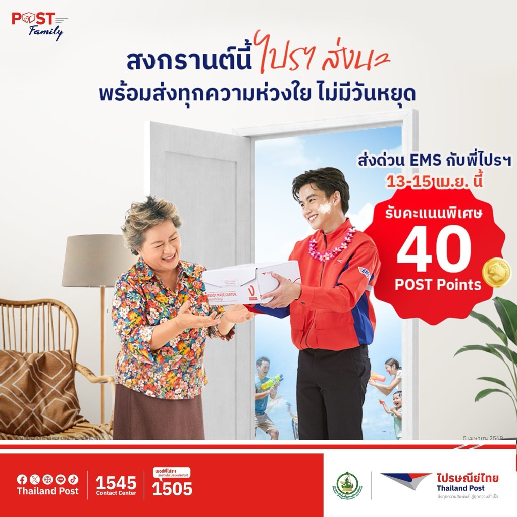 ทั้งนี้ ในช่วงเทศกาลสงกรานต์ ระหว่างวันที่ 13 – 15 เมษายน 2569 การนำจ่ายสิ่งของจะหยุดให้บริการชั่วคราว โดยผู้ใช้บริการสามารถวางแผนการจัดส่งล่วงหน้าได้ ซึ่งสิ่งของที่ฝากส่งด้วยบริการส่งด่วน EMS ในประเทศ ภายในวันที่ 10 เมษายน 2569 จะได้รับภายในวันที่ 12 เมษายน 2569 ขณะที่สิ่งของที่ฝากส่งภายในวันที่ 12 เมษายน 2569 จะได้รับภายในวันที่ 17 เมษายน 2569 และสิ่งของที่ฝากส่งตั้งแต่วันที่ 13 – 15 เมษายน 2569 จะได้รับภายในวันที่ 18 เมษายน 2569