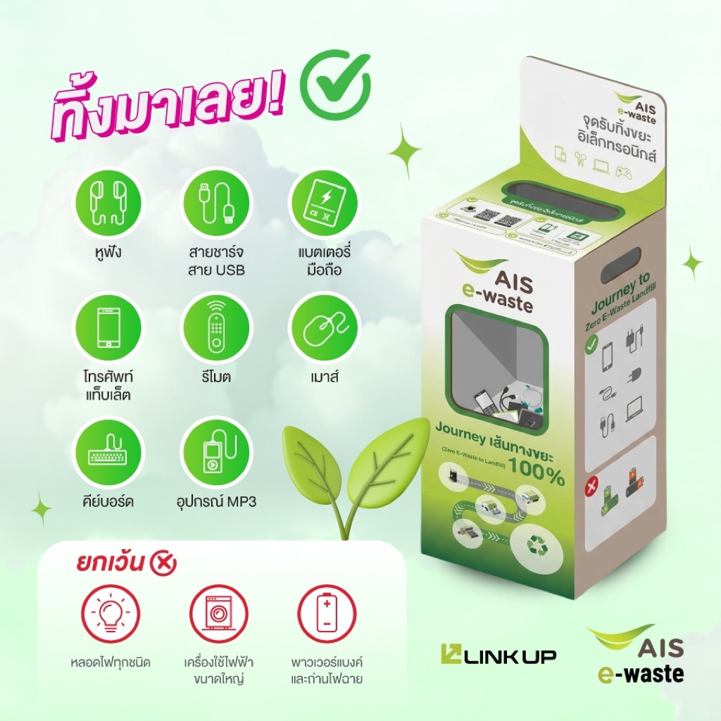 AIS จึงชวนคนไทยร่วมฉลองวันคุ้มครองโลก (Earth Day) 22 เมษายนนี้ กับแคมเปญ “E-Waste Save Money: ทิ้งปุ๊บ ลดปั๊บ” เชิญชวนลูกค้านำขยะอิเล็กทรอนิกส์ที่หมดอายุการใช้งานหรือชำรุดมาทิ้งอย่างถูกวิธี เพื่อเปลี่ยน “ขยะที่ถูกละเลย” ให้กลายเป็น “ส่วนลดที่มีมูลค่า” โดยสามารถนำ E-Waste มาทิ้งได้ที่ AIS Shop กว่า 70 สาขาทั่วประเทศ และรับส่วนลด 100 บาทต่อ 1 ชิ้น สำหรับซื้อสินค้าแบรนด์ LINK UP อุปกรณ์เสริมมือถือคุณภาพจากเอไอเอส ตอกย้ำบทบาทการเป็นตัวกลางเชื่อมโยงระบบนิเวศ (Ecosystem Enabler) ผ่าน “AIS HUB of E-Waste” ศูนย์กลางการจัดการขยะอิเล็กทรอนิกส์ของไทยที่มุ่งผลักดันให้ผู้บริโภคเปลี่ยนพฤติกรรมจากการเก็บหรือทิ้งไม่ถูกวิธี สู่การนำเข้าสู่ระบบรีไซเคิลอย่างเป็นรูปธรรม