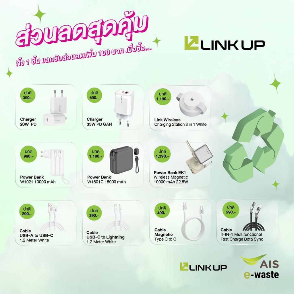 ทิ้งปุ๊บ ลดปั๊บ ดูแลโลกได้ง่าย สะดวกและคุ้มค่า ผ่านขั้นตอนง่ายๆ เพียงนำ E-Waste มาทิ้งที่จุดรับใน AIS Shop สาขาที่ร่วมรายการทั่วประเทศ พร้อมถ่ายภาพขณะทิ้ง จากนั้นลงทะเบียนรับสิทธิ์ผ่านแบบฟอร์มออนไลน์โดยกรอกข้อมูล แนบรูปถ่ายให้ครบถ้วน และแสดงข้อมูลที่ลงทะเบียนสำเร็จที่จุดชำระเงิน เพื่อรับส่วนลดทันที 100 บาทต่อ 1 ชิ้น สำหรับซื้อสินค้าใหม่ LINK UP ตั้งแต่วันนี้ – 30 มิถุนายน 2569