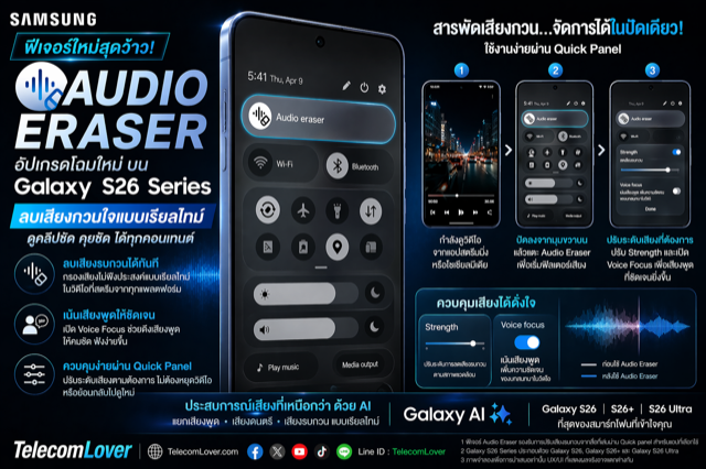 Samsung เปิดตัว Audio Eraser เวอร์ชันใหม่บน Galaxy S26 Series ใช้ AI แยกเสียงและลดเสียงรบกวนแบบเรียลไทม์ รองรับคอนเทนต์สตรีมมิ่งและโซเชียล
