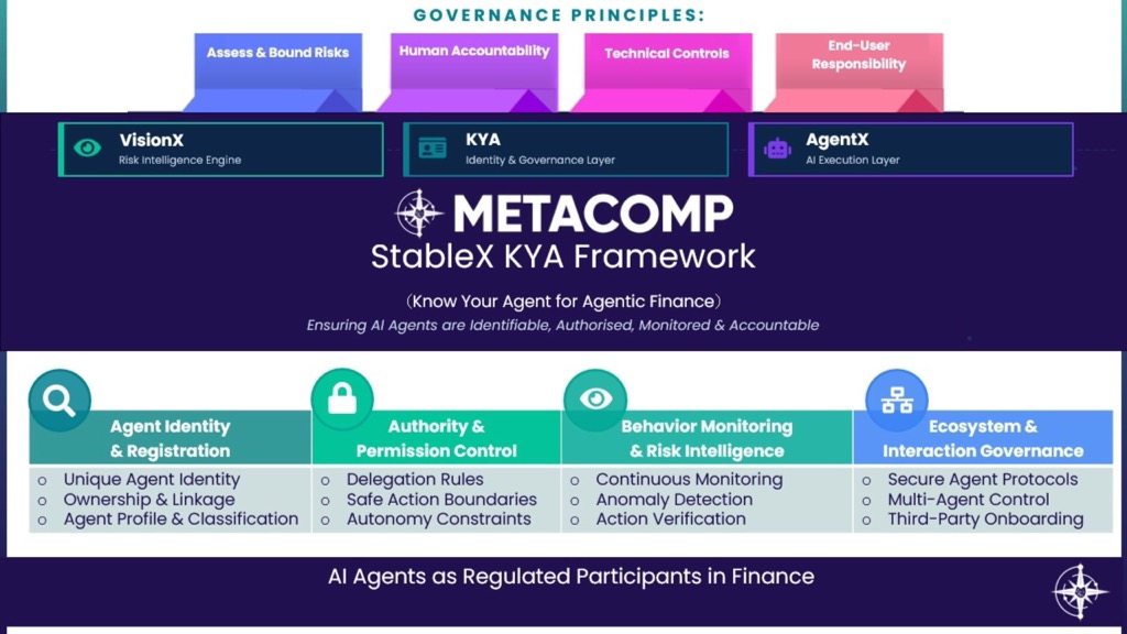 MetaComp Pte. Ltd. (MetaComp) ผู้เชี่ยวชาญด้านโซลูชันการเงินดิจิทัลแบบ Web2.5 จากสิงคโปร์ ประกาศเปิดตัว StableX Know Your Agent (KYA) Framework อย่างเป็นทางการ ณ งาน Money20/20 Asia กรุงเทพฯ โดยถือเป็นกรอบธรรมาภิบาลสำหรับปัญญาประดิษฐ์ (AI Agents) ในอุตสาหกรรมการเงินฉบับแรกของโลกที่พัฒนาโดยสถาบันการเงิน ครอบคลุมทั้งระบบการชำระเงิน การปฏิบัติตามกฎระเบียบ (Compliance) และการบริหารความมั่งคั่ง เพื่อสร้างมาตรฐานใหม่ในการระบุตัวตนและตรวจสอบความรับผิดชอบของ AI ในระดับสากล