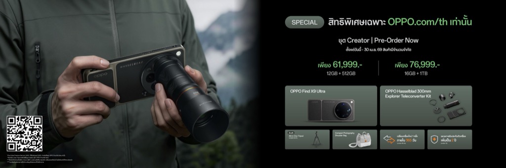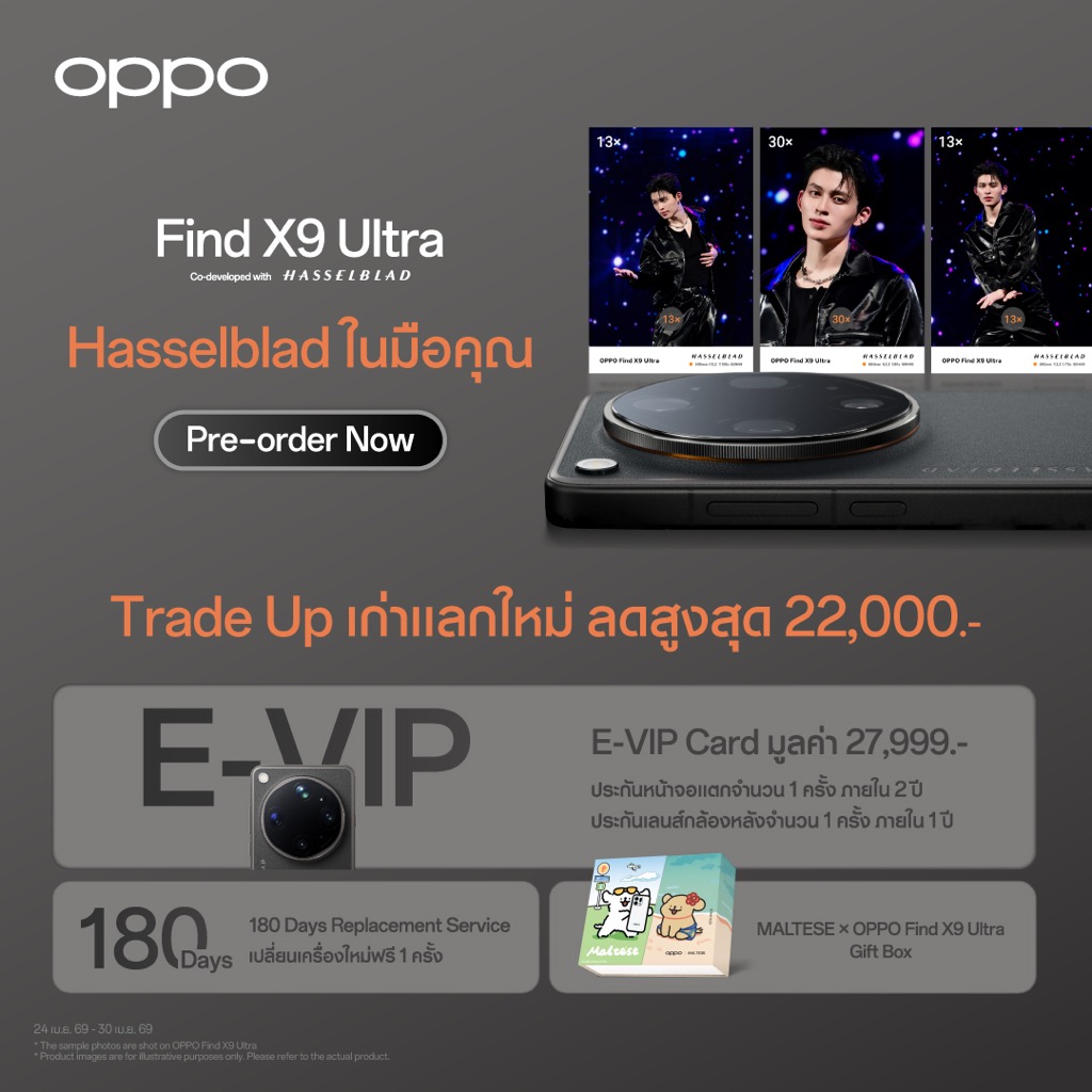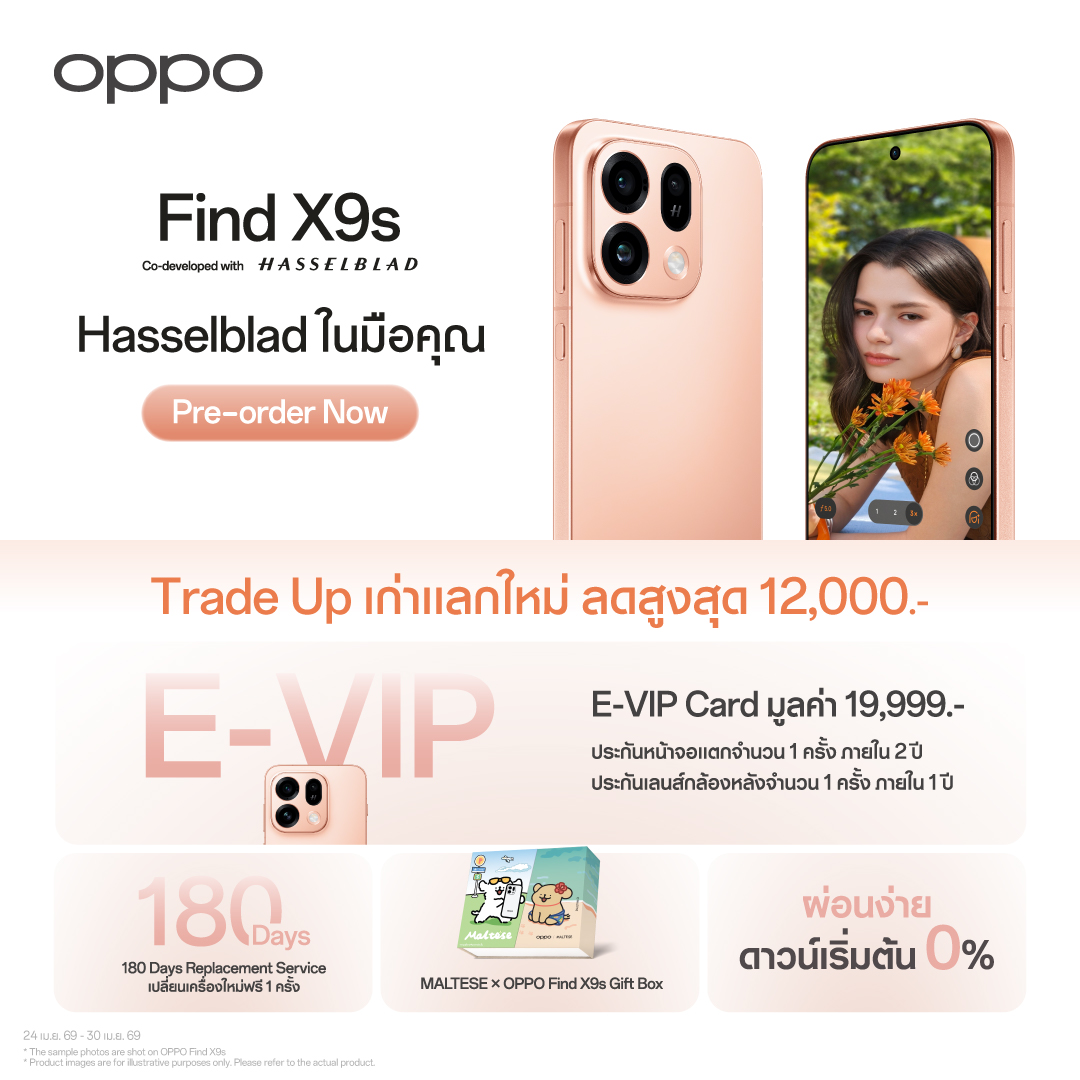 สำหรับผู้ที่สนใจเป็นเจ้าของ OPPO Find X9 Ultra และ OPPO Find X9s สามารถสั่งจองได้ตั้งแต่วันที่ 24 – 30 เมษายน 2569 พร้อมรับข้อเสนอสุดพิเศษในช่วง Pre-order และเป็นเจ้าของได้ง่ายมากยิ่งขึ้นด้วยโปรโมชั่น Trade-up นำเครื่องเก่ามาแลกเครื่องใหม่ ลดสูงสุด 22,000 บาท