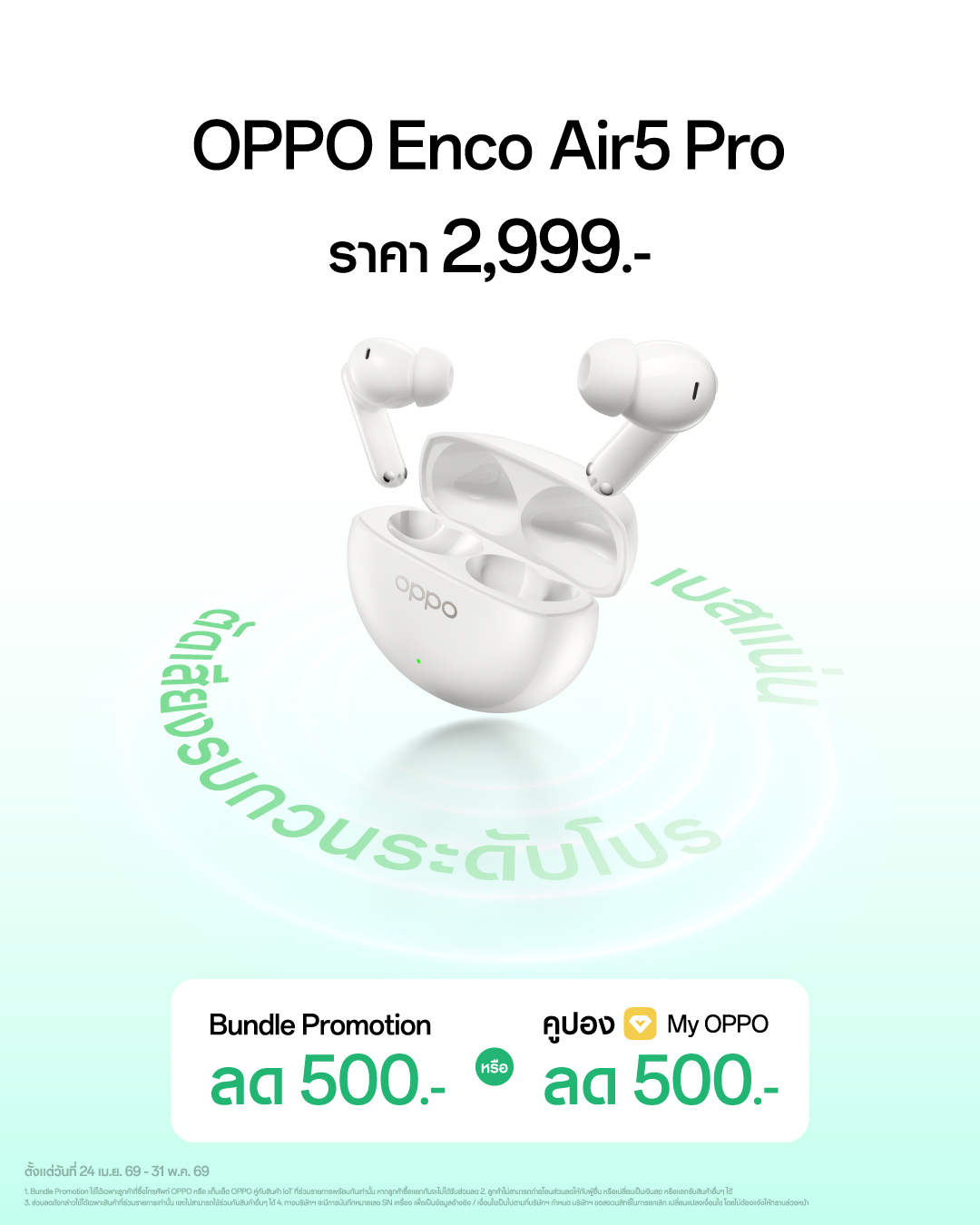 ต่อกันที่หูฟังไร้สายระดับโปร OPPO Enco Air5 Pro ที่ยกระดับประสิทธิภาพการตัดเสียงรบกวนแบบเรียลไทม์ขึ้นถึง 2 เท่า พร้อมผ่านการรับรองมาตรฐานการตัดเสียงรบกวนประสิทธิภาพสูงจาก TÜV Rheinland ในระดับ 55 เดซิเบล ทำงานร่วมกับระบบไมโครโฟน AI 3 ตัว และ AI Clear Call รุ่นใหม่เพื่อความคมชัดสูงสุดในทุกคู่สาย  ในด้านคุณภาพเสียง มาพร้อมไดรเวอร์ขนาดใหญ่ 12 มม. เคลือบไทเทเนียม มอบเสียงเบสที่ทรงพลัง รองรับมาตรฐาน Hi-Res Audio และ LHDC 5.0 เพื่อการดื่มด่ำเต็มอรรถรสในทุกการฟัง พร้อมระบบตัดเสียงรบกวนอัจฉริยะที่สามารถปรับลดเสียงตามสภาพแวดล้อมได้โดยอัตโนมัติ นอกจากนี้ยังอัดแน่นด้วยเทคโนโลยีอัจฉริยะ ทั้งฟีเจอร์ AI Translate แปลภาษาแบบเรียลไทม์ การเชื่อมต่อสองอุปกรณ์พร้อมกันอย่างราบรื่น และควบคุมสะดวกด้วยระบบสัมผัสที่สามารถแตะเพื่อเล่น Spotify หรือเลื่อนเพื่อปรับระดับเสียงได้ทันที โดยตัวหูฟังมีน้ำหนักเบาเพียง 4.4 กรัม สวมใส่สบายได้ตลอดวัน มั่นใจในทุกกิจกรรมด้วยมาตรฐานกันน้ำกันฝุ่นระดับ IP55 และตอบโจทย์การใช้งานยาวนานเป็นพิเศษรวมสูงสุดถึง 54 ชั่วโมง มีให้เลือก 2 สี ได้แก่ ดำ Matt Black และ ขาว Pearl White วางจำหน่ายในราคา 2,999 บาท