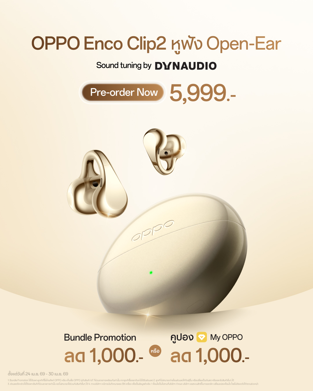 ในด้านออดิโอ ออปโป้เปิดตัวหูฟัง 2 รุ่น 2 สไตล์ นำโดย หูฟังโอเพนเอียร์รุ่นใหม่ล่าสุด OPPO Enco Clip2 โดดเด่นด้วยดีไซน์แบบ Ear Cuff รูปทรงไร้รอยต่อที่เน้นความเบาสบายและกระชับหูด้วยทรงโค้งแบบ Zero-Sense รับทุกสรีระใบหู มาในคอนเซปต์ดีไซน์เทรนดี้มิกซ์แอนด์แมตช์เข้ากับทุกสไตล์ได้ในสีทอง Luminous Gold และสีเงิน Slate Grey โดยผู้ใช้งานสามารถสวมใส่ได้สะดวกโดยไม่ต้องแยกซ้าย-ขวา แต่ยังคงมอบคุณภาพเสียงสเตอริโอที่ทรงพลังและชัดเจนแม้ใช้งานกลางแจ้ง ยกระดับคุณภาพเสียงระดับแฟลกชิปด้วยการเป็นหนึ่งเดียวในกลุ่มหูฟังโอเพนเอียร์ที่ได้รับการปรับจูนเสียงจากแบรนด์ระดับโลกอย่าง Dynaudio ทำงานร่วมกับไดรเวอร์คู่และชิป AI Quad-Core (6nm) เสริมด้วยเทคโนโลยีควบคุมทิศทางเสียงเพื่อความเป็นส่วนตัวในรัศมี 30 ซม. มั่นใจได้ในทุกการสนทนาด้วยเทคโนโลยี AI Talk และ Bone Conduction ที่ช่วยให้การสนทนาคมชัด พร้อมมาตรฐานกันน้ำกันฝุ่นระดับ IP55 รองรับการเชื่อมต่อเสถียรผ่าน Bluetooth 6.1 และเชื่อมต่อได้พร้อมกันสองอุปกรณ์ข้ามระบบปฏิบัติการทั้ง iOS และ Android โดยสามารถใช้งานได้ยาวนานต่อเนื่องสูงสุดถึง 40 ชั่วโมง วางจำหน่ายในราคา 5,999 บาท