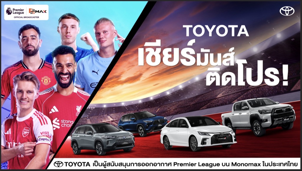 บริษัท โตโยต้า มอเตอร์ ประเทศไทย จำกัด ร่วมมือกับ บริษัท โมโนสตรีมมิ่ง จำกัด หรือ Monomax แพลตฟอร์มหลักในการถ่ายทอดสดพรีเมียร์ลีก และ บริษัท จัสมิน อินเตอร์เนชั่นแนล จำกัด (มหาชน) หรือ JAS ผู้ถือลิขสิทธิ์การถ่ายทอดสดฟุตบอลพรีเมียร์ลีก และ เอมิเรตส์ เอฟเอ…